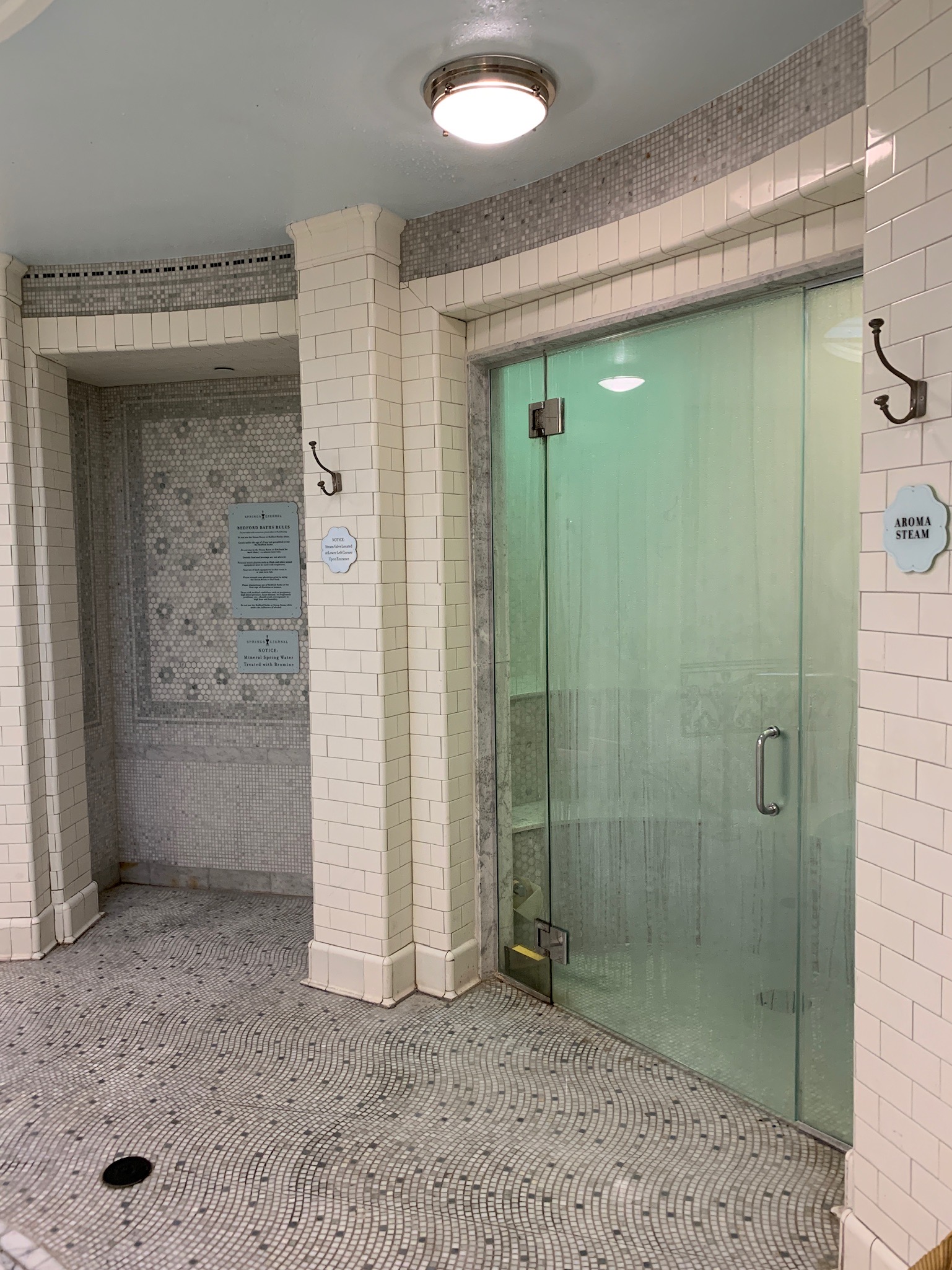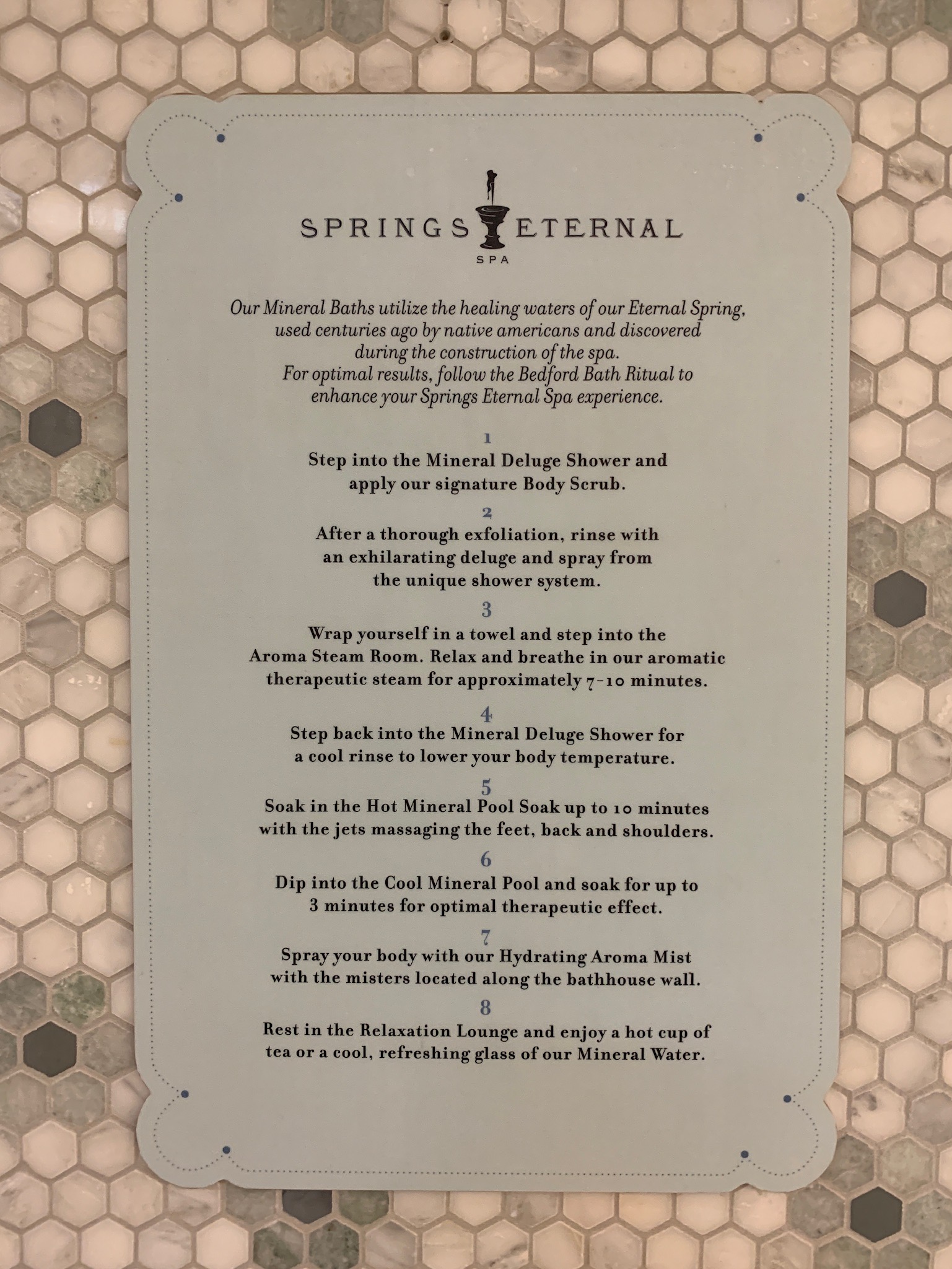 One of my favorite things in life is to indulge in a spa day. Not only is it therapeutic for the body, but my personal and professional psyche feel rejuvenated after steaming out toxins, soaking in bubbles, sipping on herbal tea, and spending QT with my love. We were excited to be pampered after a vigorous morning run around the beautiful, hilly Old Course. After repeated sessions of the bath ritual and our massage treatments, we swapped out our swimsuits for plush robes and wrapped ourselves in blankets, anticipating quiet time together; chatting, reading, and napping. The co-ed lounge, accessed from the women’s and men’s spa areas, is a warm, cozy space. The fireplace was lit, as it was a cool mid-March afternoon. A wall of windows overlook the hills, with an outdoor patio anticipating spa-goers during warmer months. We whiled away the afternoon, snacking on fruit and granola, sipping on herbal tea by The Art of Tea, and spending time in our respective wet rooms undertaking the bath rituals. Keep in mind swim suits are required in the wet spa areas, but encouraged to not be worn under robes into the lounge. We both left Springs Eternal feeling cleansed, relaxed, and happy with such a special experience.