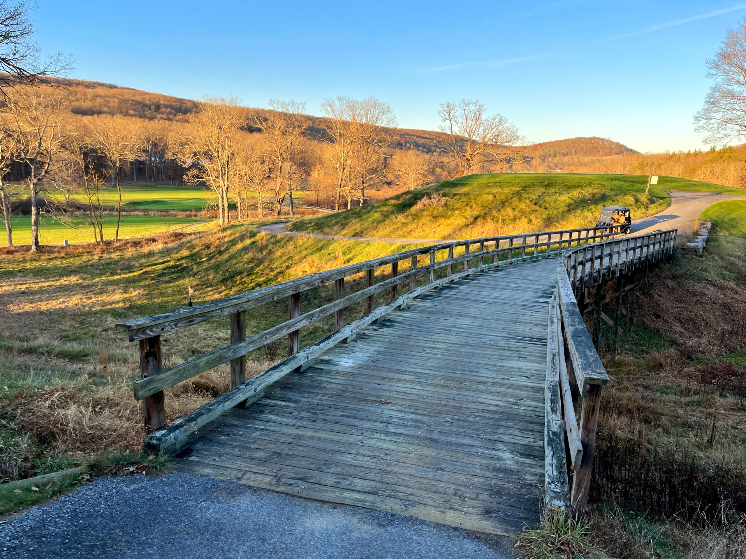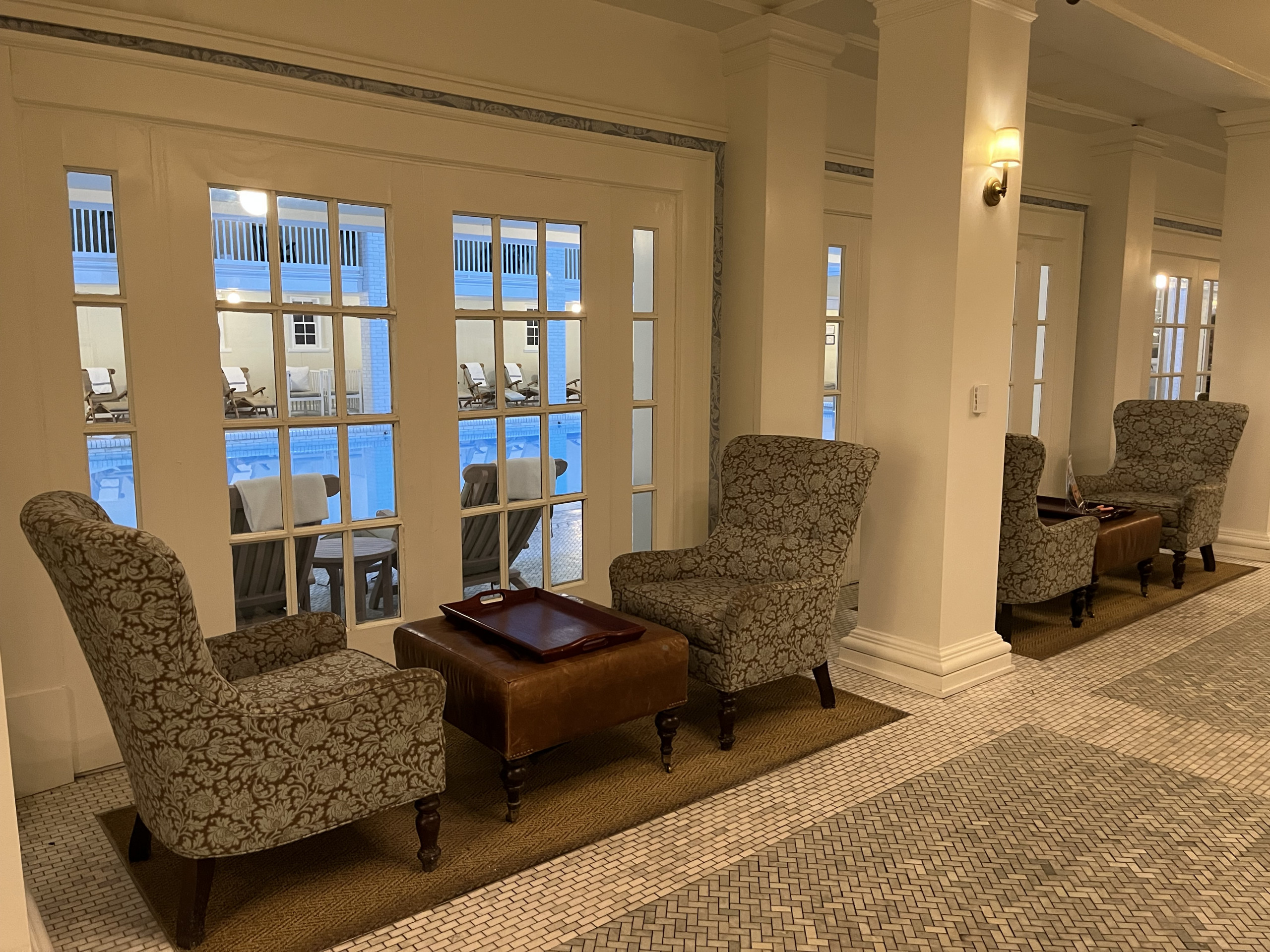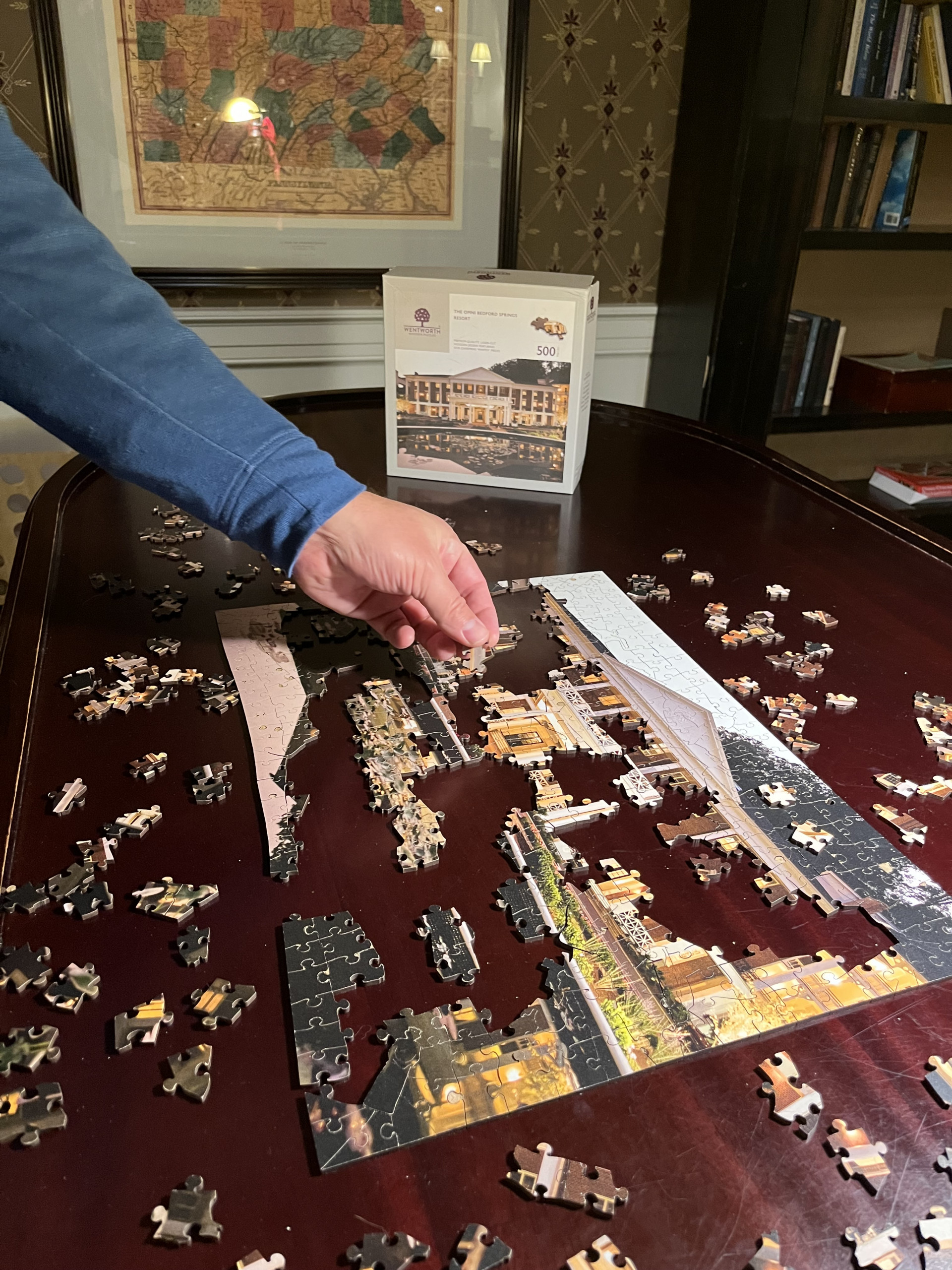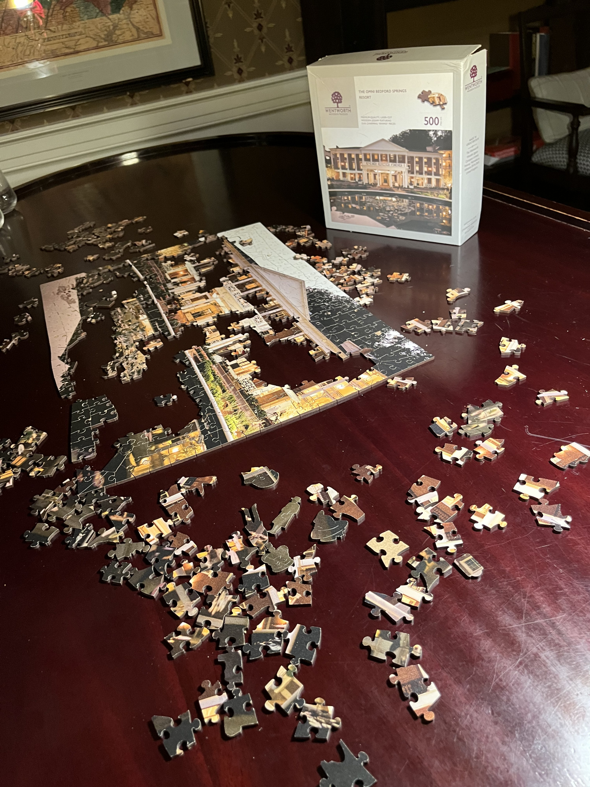 Keeping the birthday golf tradition alive on the gorgeous and highly challenging Old Course at The Omni Bedford Springs Resort. The beautiful Allegheny Mountains surround the historic course (c. 1895) while a babbling trout stream criss-crosses through it. Our room overlooked the golf course, allowing us to watch the blazing autumn sunsets. We both really appreciate the resort’s decor as a thoughtful combination of colonial and modern colonial. Its warm color palate, carpets, and lighting devices throughout the rooms and public spaces inspired us to look up the interior design company’s dossier. 3North’s Design Guide lists all of the architectural features, paint colors, textiles, wall coverings and even the color scheme for plants throughout the grounds. The common areas are super cozy and we made several contributions to the communal puzzle, which was finished as random puzzlers passed through the library. History abounds at Bedford Springs. In 1905, Bedford opened one of the first indoor pools in the country, while the Golf course is one of the oldest and has the oldest first tee in America.