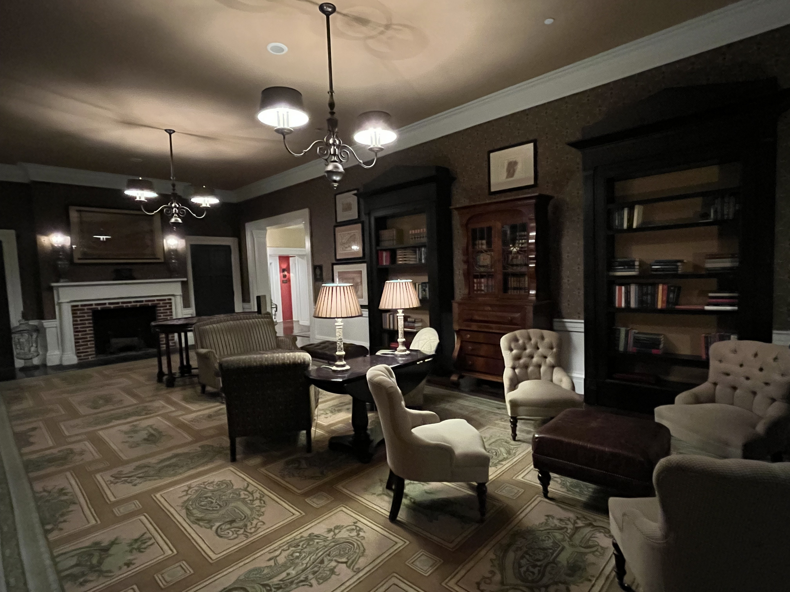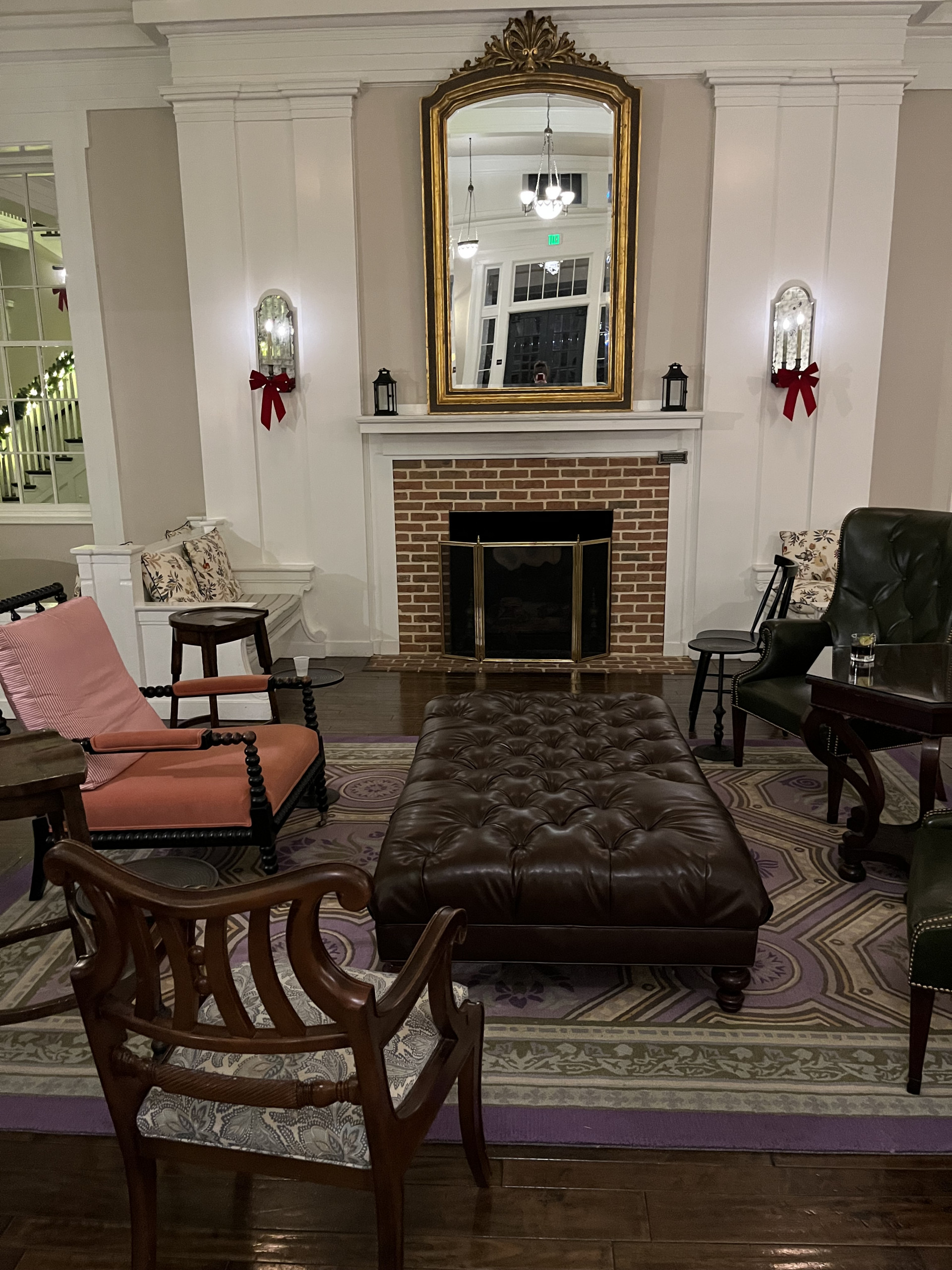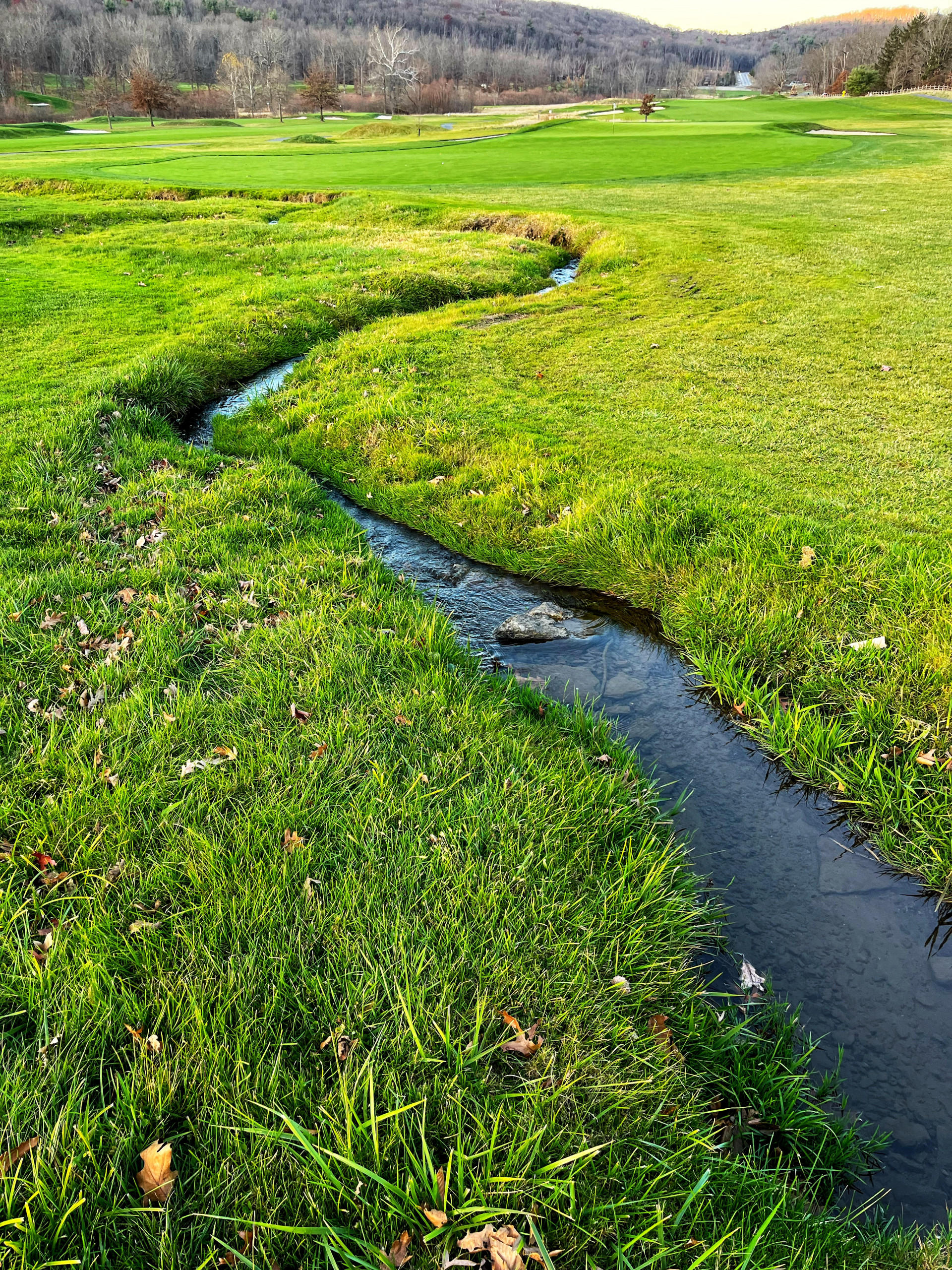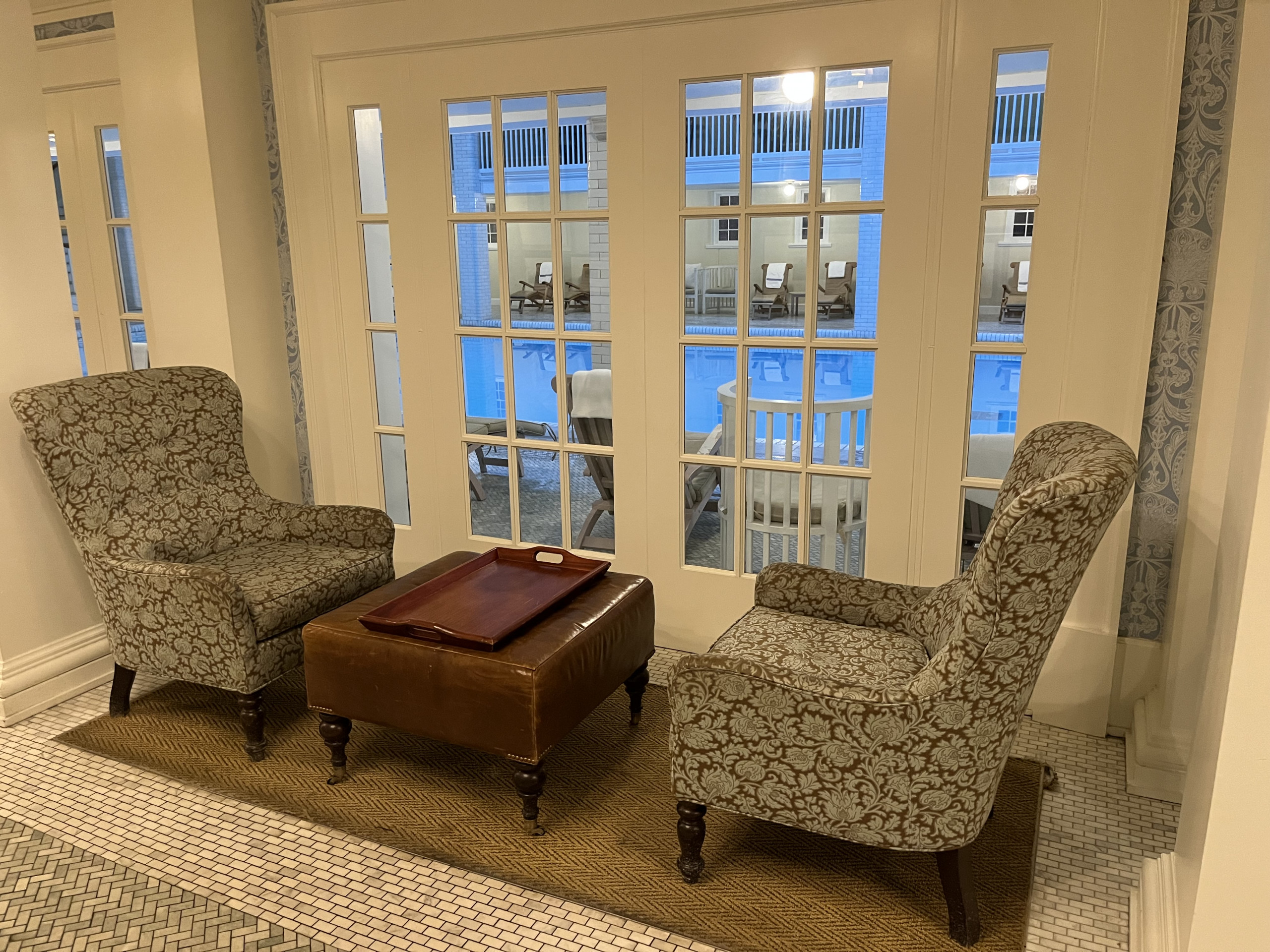 Keeping the birthday golf tradition alive on the gorgeous and highly challenging Old Course at The Omni Bedford Springs Resort. The beautiful Allegheny Mountains surround the historic course (c. 1895) while a babbling trout stream criss-crosses through it. Our room overlooked the golf course, allowing us to watch the blazing autumn sunsets. We both really appreciate the resort’s decor as a thoughtful combination of colonial and modern colonial. Its warm color palate, carpets, and lighting devices throughout the rooms and public spaces inspired us to look up the interior design company’s dossier. 3North’s Design Guide lists all of the architectural features, paint colors, textiles, wall coverings and even the color scheme for plants throughout the grounds. The common areas are super cozy and we made several contributions to the communal puzzle, which was finished as random puzzlers passed through the library. History abounds at Bedford Springs. In 1905, Bedford opened one of the first indoor pools in the country, while the Golf course is one of the oldest and has the oldest first tee in America.