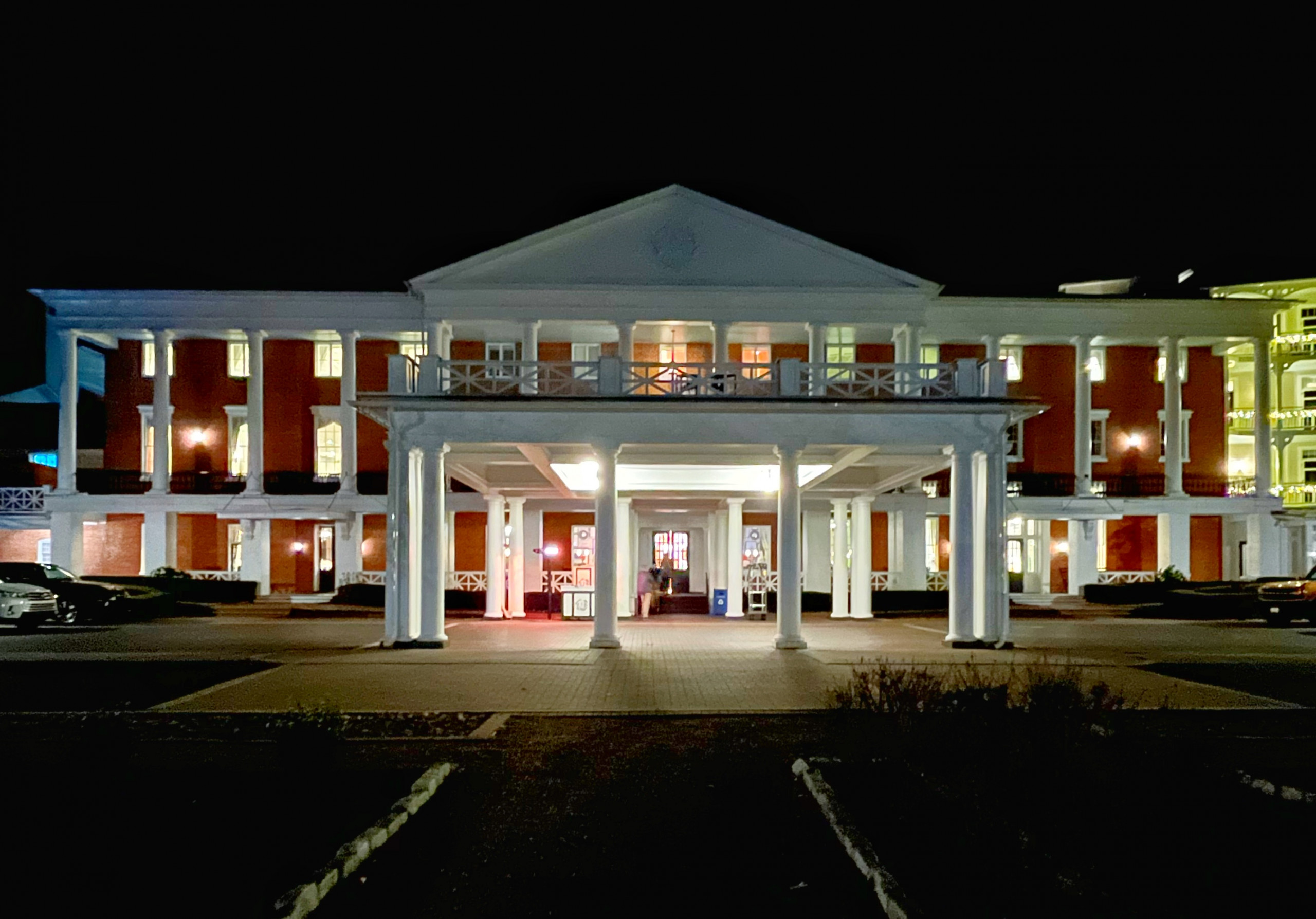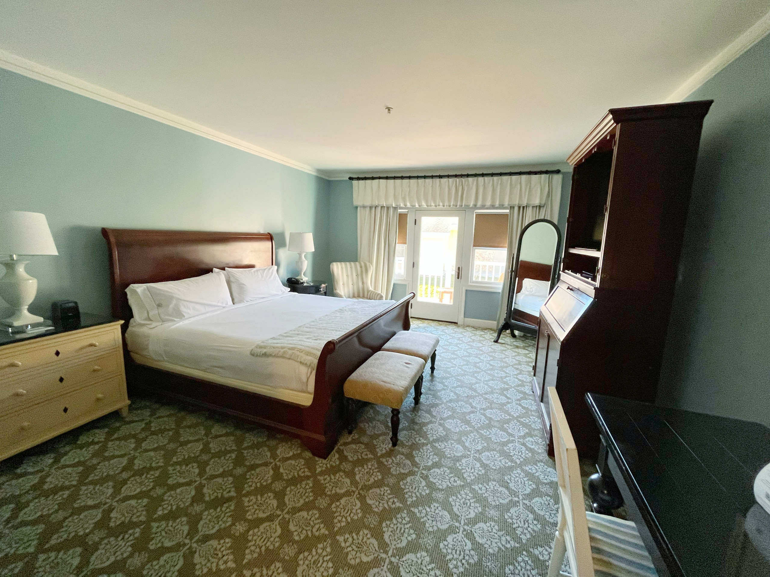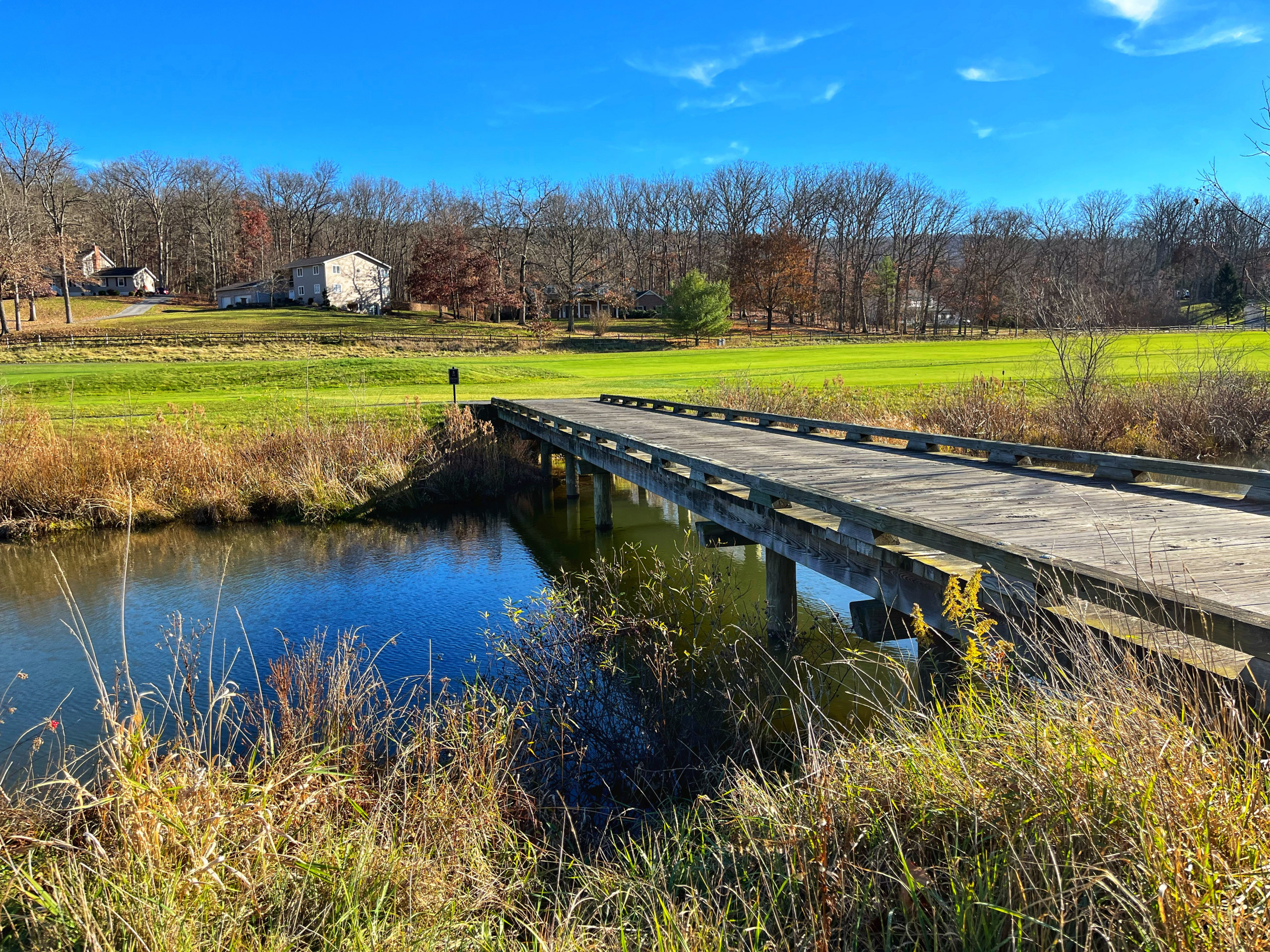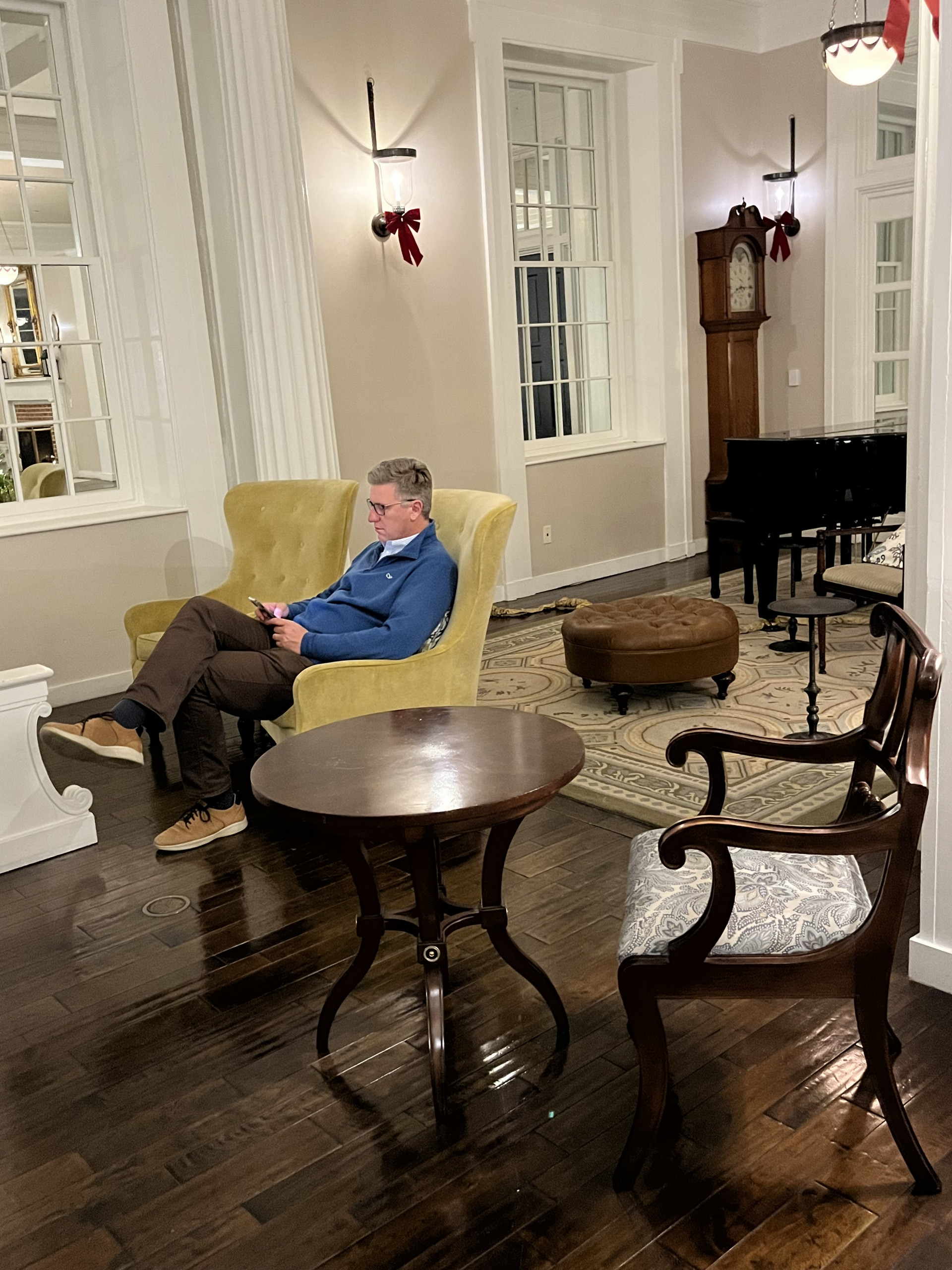 Keeping the birthday golf tradition alive on the gorgeous and highly challenging Old Course at The Omni Bedford Springs Resort. The beautiful Allegheny Mountains surround the historic course (c. 1895) while a babbling trout stream criss-crosses through it. Our room overlooked the golf course, allowing us to watch the blazing autumn sunsets. We both really appreciate the resort’s decor as a thoughtful combination of colonial and modern colonial. Its warm color palate, carpets, and lighting devices throughout the rooms and public spaces inspired us to look up the interior design company’s dossier. 3North’s Design Guide lists all of the architectural features, paint colors, textiles, wall coverings and even the color scheme for plants throughout the grounds. The common areas are super cozy and we made several contributions to the communal puzzle, which was finished as random puzzlers passed through the library. History abounds at Bedford Springs. In 1905, Bedford opened one of the first indoor pools in the country, while the Golf course is one of the oldest and has the oldest first tee in America.