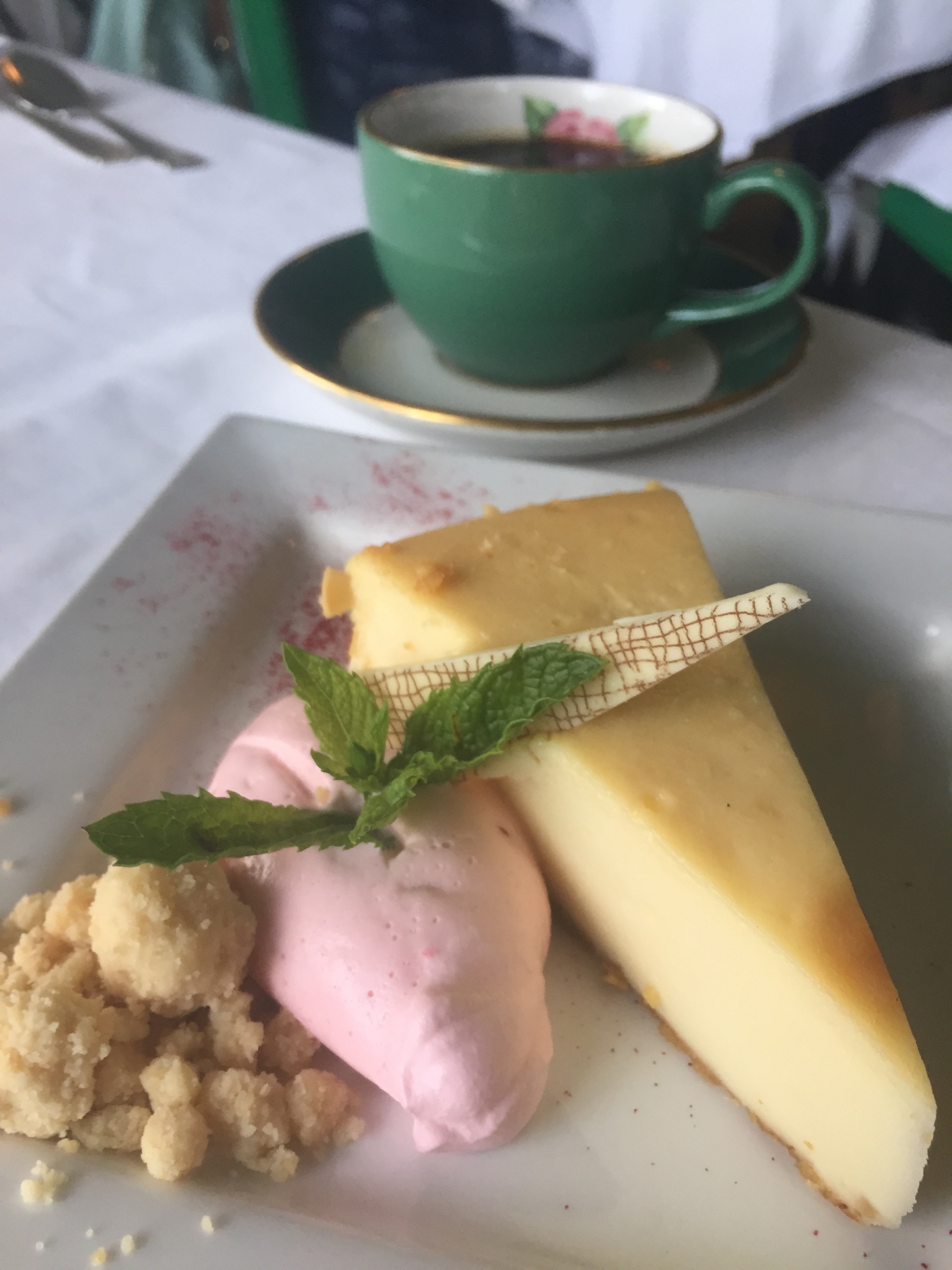 I must have been in the mood for duck this day having ordered it for two of my five courses: smoked duck breast with duck liver mousse as the appetizer along with a zingy escarole salad. My entrée of the five spice seared duck breast was artfully plated atop a polenta cake nestled in a pool of delicious, not-too-sweet plum soy sauce. However, I couldn’t stop thinking about that consommé. We were hoping a few glasses of wine would inspire some clever tactic for acquiring a third cup, but I was not about to forego dessert to make that happen. I often half-joke about how white chocolate isn’t “real” chocolate, but it’s chic and for some reason, I opted for it this day.  Dinner ended on a sweet note of white chocolate cheesecake with fluffy strawberry crème fraîche and almond crumble.