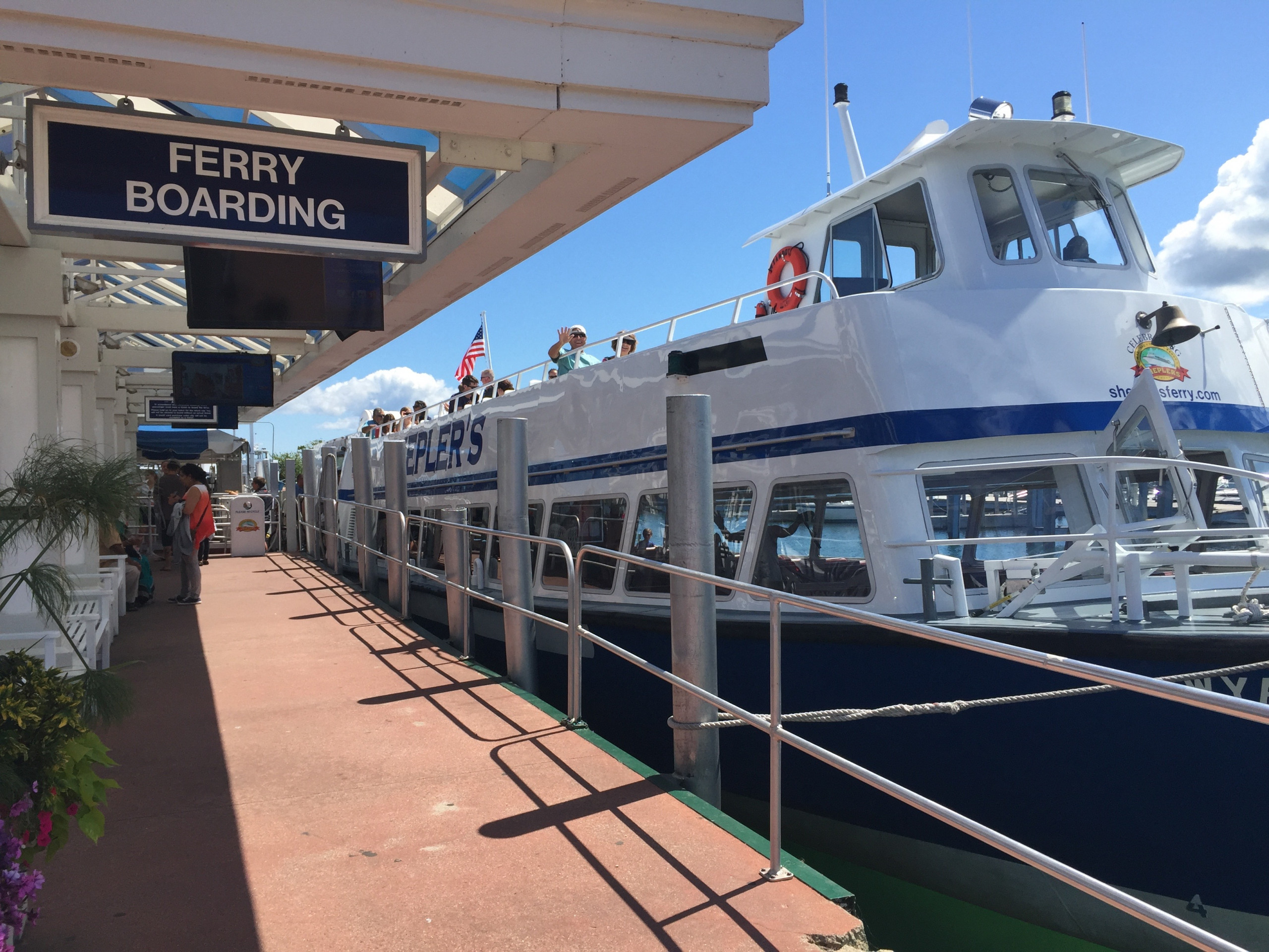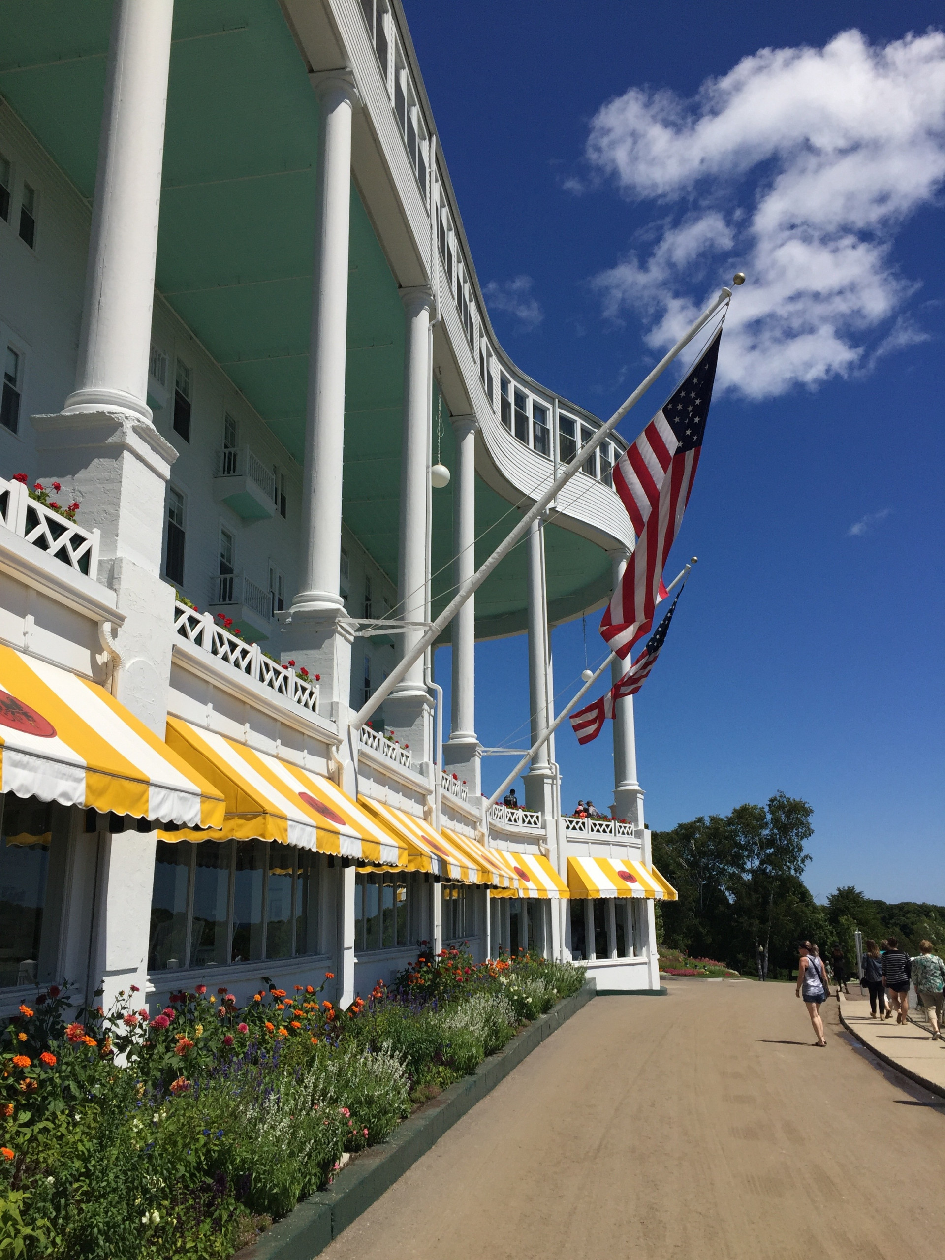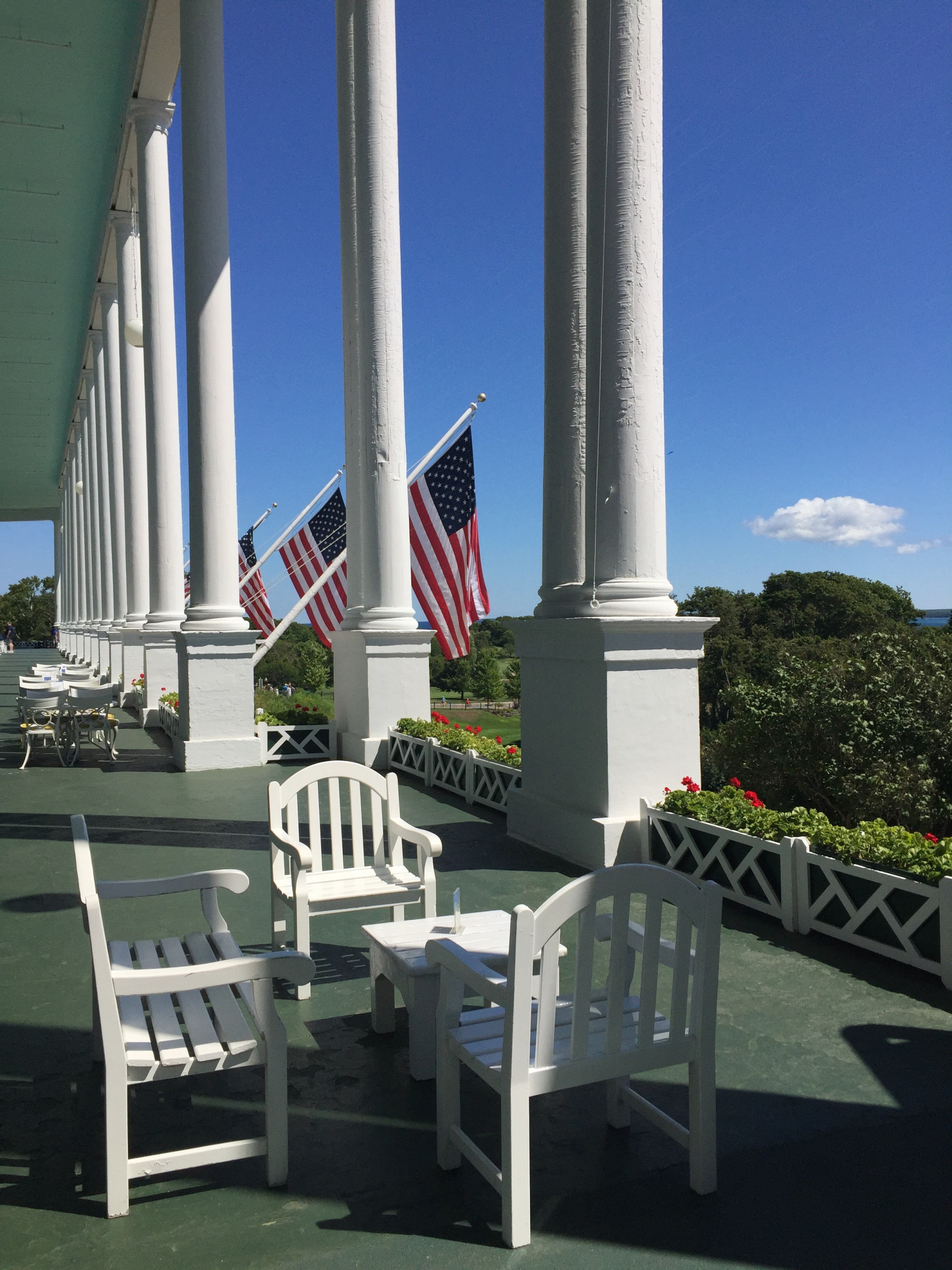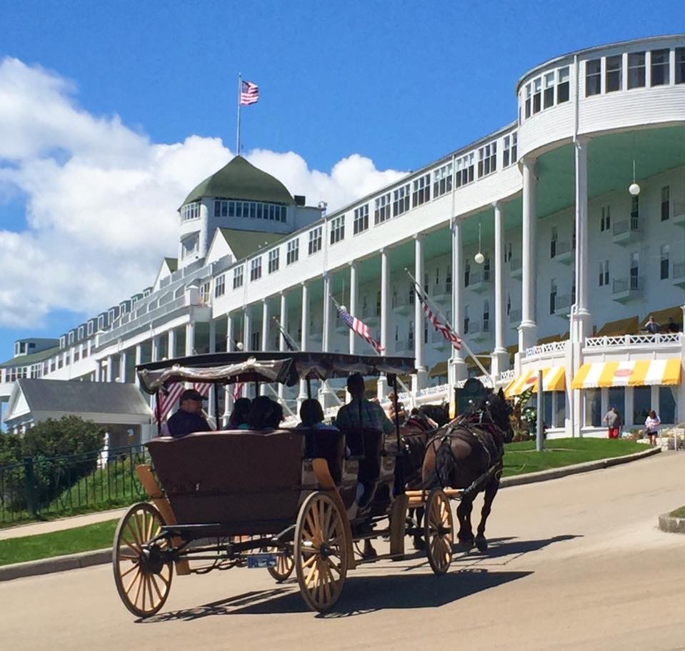 The Grand Hotel experience begins even before stepping foot onto northern Michigan’s Mackinac Island. First glimpse of the stately white columns and billowing flags of the hotel unfurling along the hillside hints at the timeless luxury that awaits across across the bay. The fifteen-minute ferry ride (we used Shepler’s Ferry out of Mackinaw City) is just a teaser as the boat closes in on the quaint harbor town and the hotel slips out of site. The Chamber of Commerce weather boosted our excitement even further as we zipped across the crystal blue water. After docking, a clamor of ferry passengers descended upon their respective luggage trolleys. Then it became apparent the special treatment Grand Hotel guests are given even prior to check in. Our baggage was carried ahead as part of our hotel stay, allowing for hands free maneuvering to find the Grand Hotel transportation, which was a old timey, horse-drawn carriage waiting just off the dock.