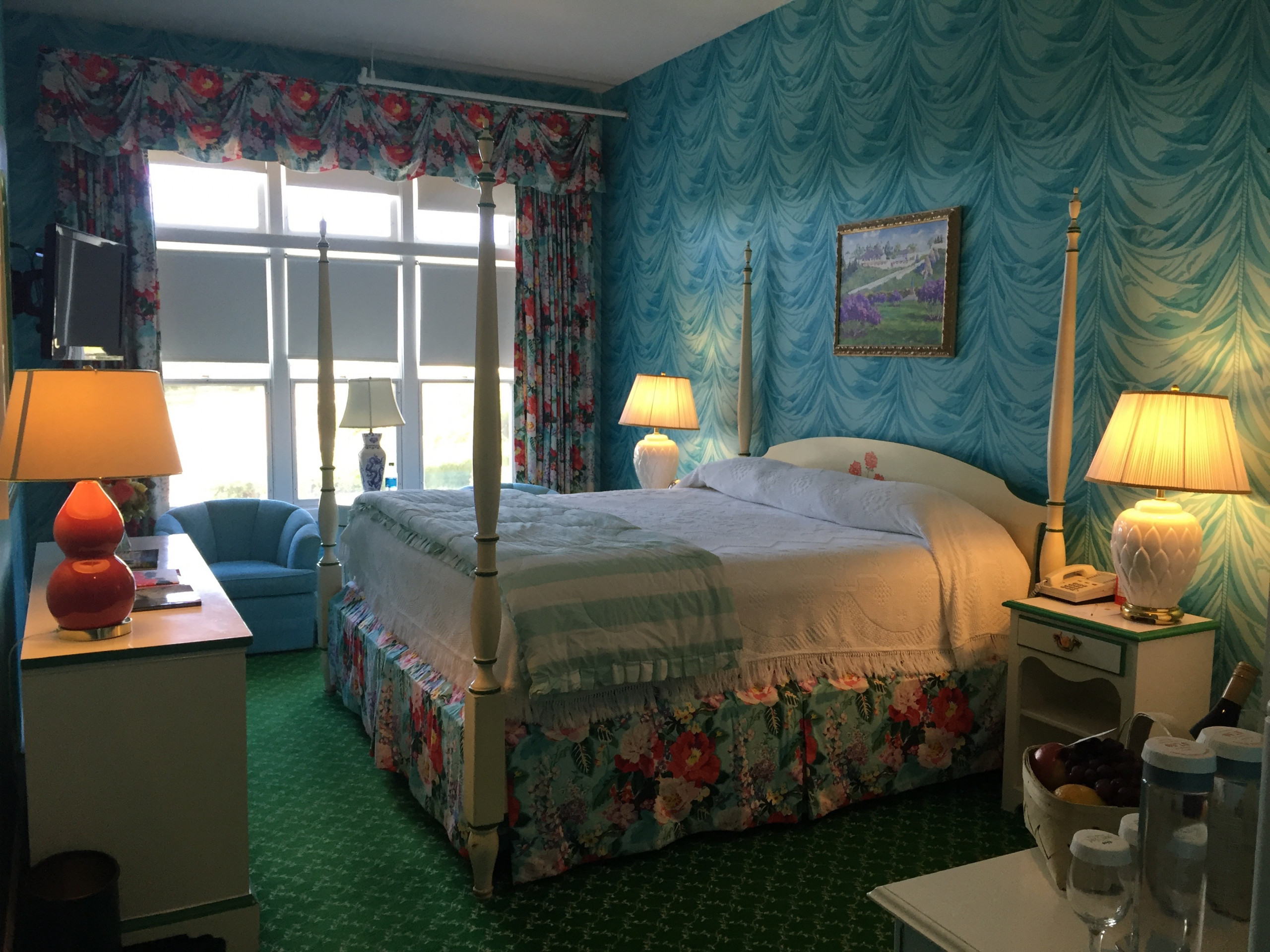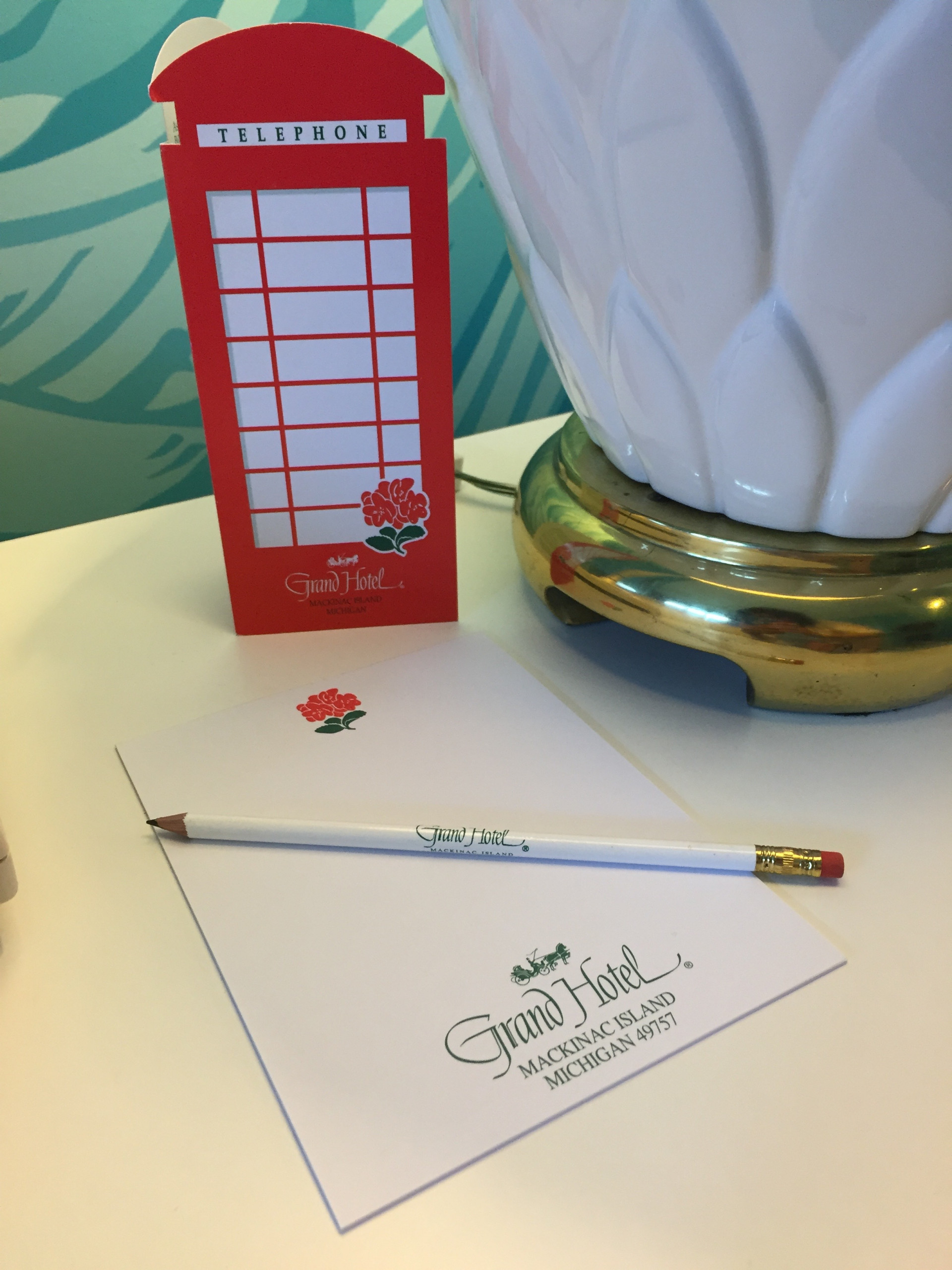 After checking in, we made our way up the stairs, through the parlor and along the hotel wing to our rooms. Mandy commented that it was as if we walked on to the Titanic. I would not disagree. My room, #16 was a few doors down and the luggage wasn’t far behind, delivered by a friendly bellhop. My parlor-level room was a perfect place to raise the windows and watch horses and people parade by while catching the sun shimmering on the lake off in the distance. Even though the room was ground level, the landscaping was thoughtfully designed as to naturally protect the windows from passers by. Every room is decorated differently. After peeking into others during cleaning service, I realized the amount of character and thought put into each space. The rooms have serious personality, but several little details tickled my fancy: skinny Grand Hotel pencils, delicate cups in the coffee station, old school keys, a matchbook of mini-nail files, and red British phone booth cards with television information. The turndown service was a treat as the shades and curtains were drawn, used towels or cups replaced, and minty chocolates ensured sweet dreams.