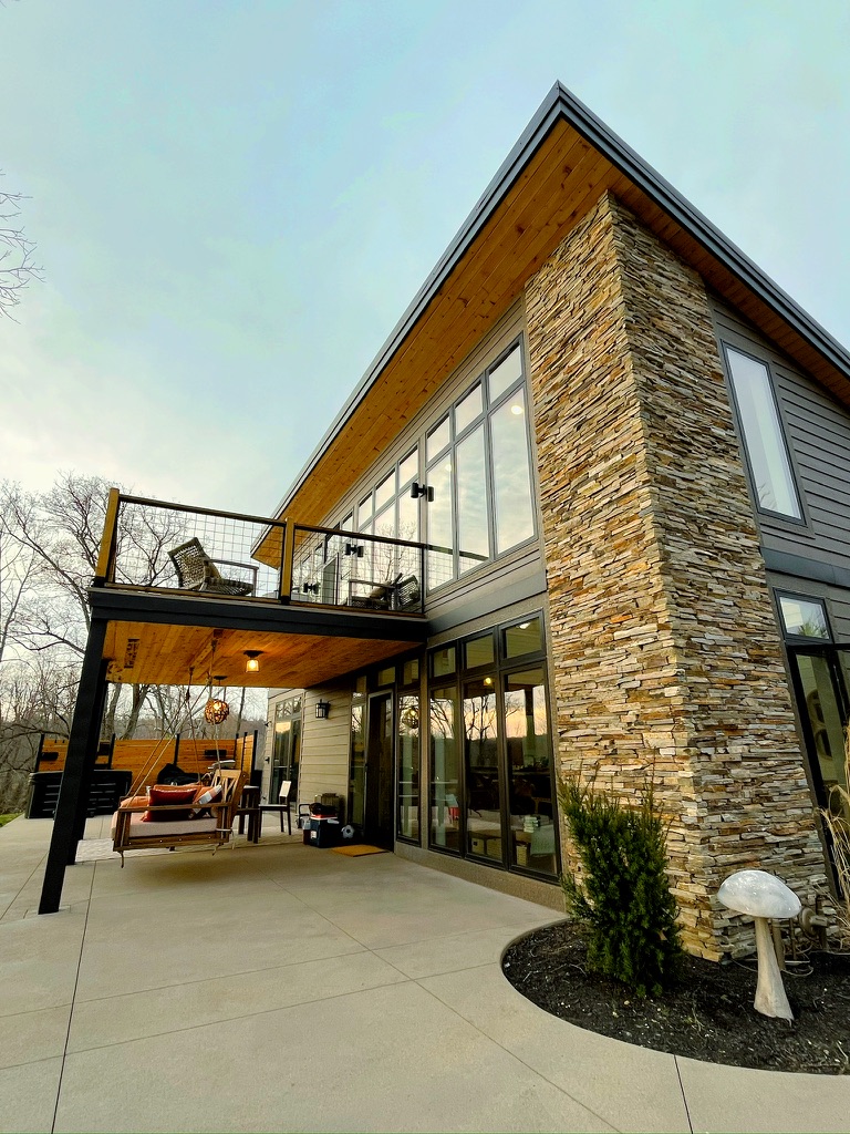 Upstairs, the second bedroom is equally inviting, with a comfortable queen bed and its own private bathroom. Both bathrooms feature walk-in showers and are stocked with high-end toiletries, including luxurious, eco-friendly ROAM shower products from Indianapolis. There’s also a charming little work station (or in Madalyn’s case, a fabulous make-up vanity) that overlooks the great room. A door from this area opens to a second-floor outdoor patio, where you can take in the scenic river and fire pit below—another perfect spot to start the day with a cup of coffee or unwind with a drink after a day of adventures.