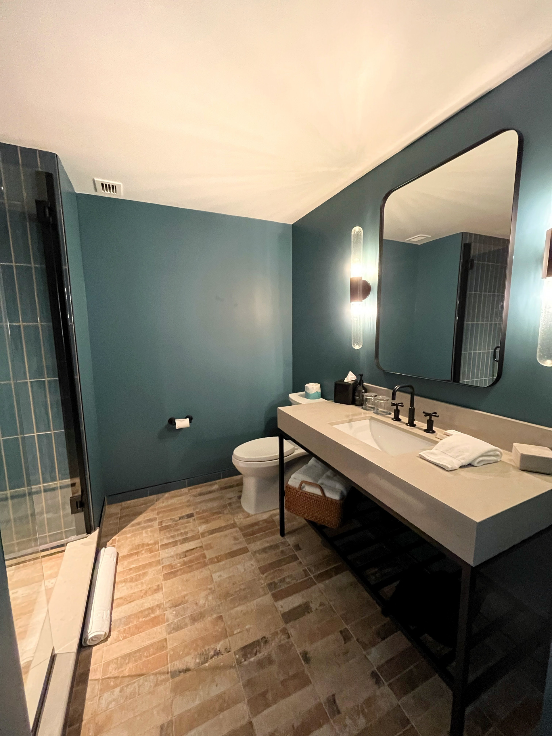 The hotels public spaces are warm and communal (if you want to be). There is a nice outdoor patio with a wood-burning fireplace and indoor workstations. The Gear Garage is a great way to get interactive with the neighborhood and city, as you can rent complimentary bikes, scooters, kayaks, and all sorts of other lawn games and cameras. For late-night nosh, the Poutine Window is open in the evenings.