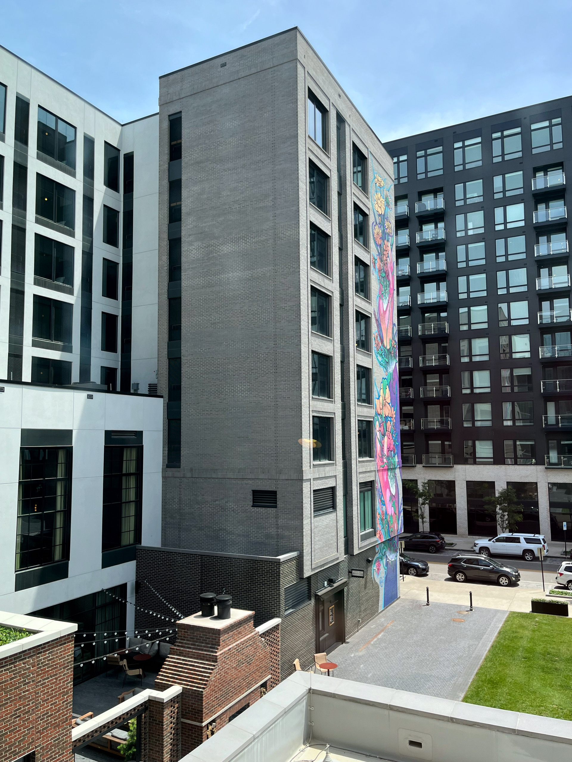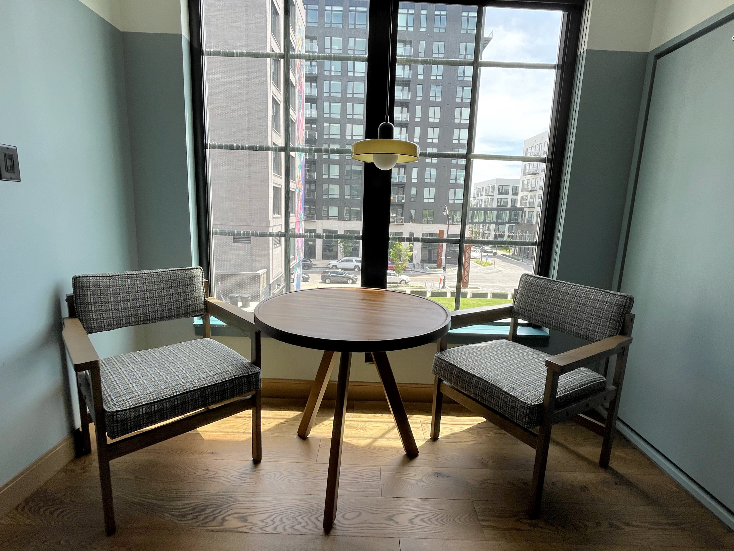 We used The Junto Hotel as our home base for a staycation in Franklinton as part of my research for The Insiders Guide to Columbus, 3rd ed. It was our first time staying here and we had a really nice experience. The king suite was spacious and modern with nice amenities like refillable water bottles, Bodum pour-over style coffee makers, nifty lighting, and a cool window bench overlooking the patio and green space.