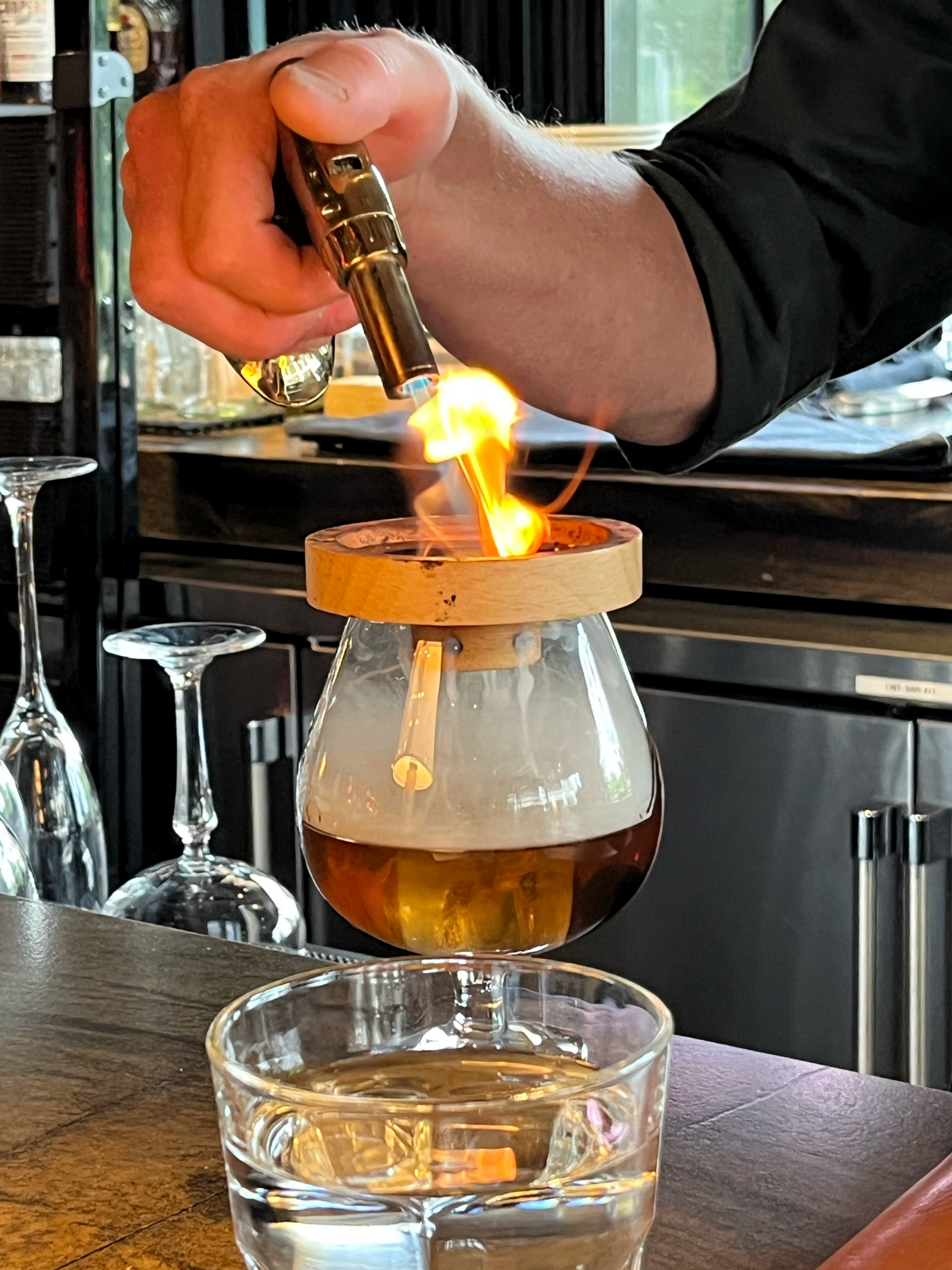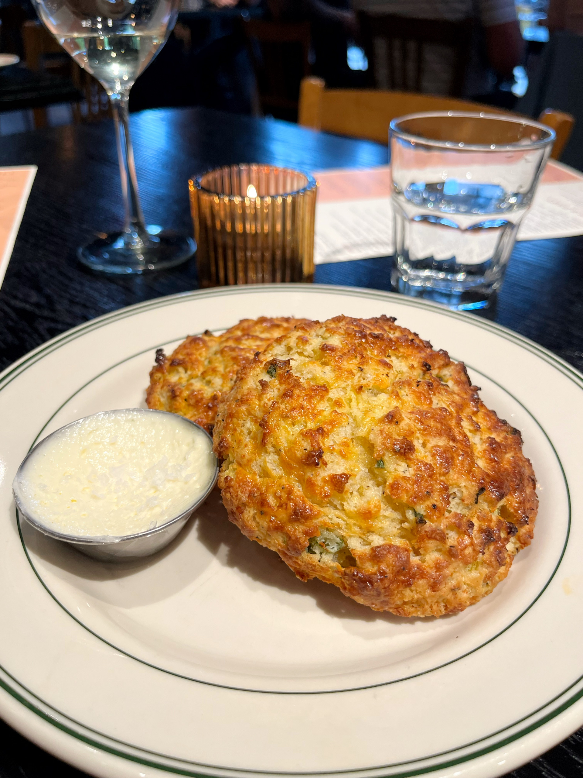 Dinner at Little West Tavern is a bit pricy (especially the drinks!)  and the menu is meat-heavy. That said, the restaurant is a beautiful space with an open wood fired hearth and lovely patio. We were seated at a regular table, but there are a few seats around the chef’s counter, which we would try to get next time. We wanted to see how they did non-meat dishes so we ordered the ceviche for starters along with the cheddar biscuits. The biscuits were great and the ceviche was super fresh, but even with the chili crisp, it still needed some heat and salt. We decided to do a surf and turf for dinner and ordered the steak Diane and ember roasted prawns- both grilled masterfully.