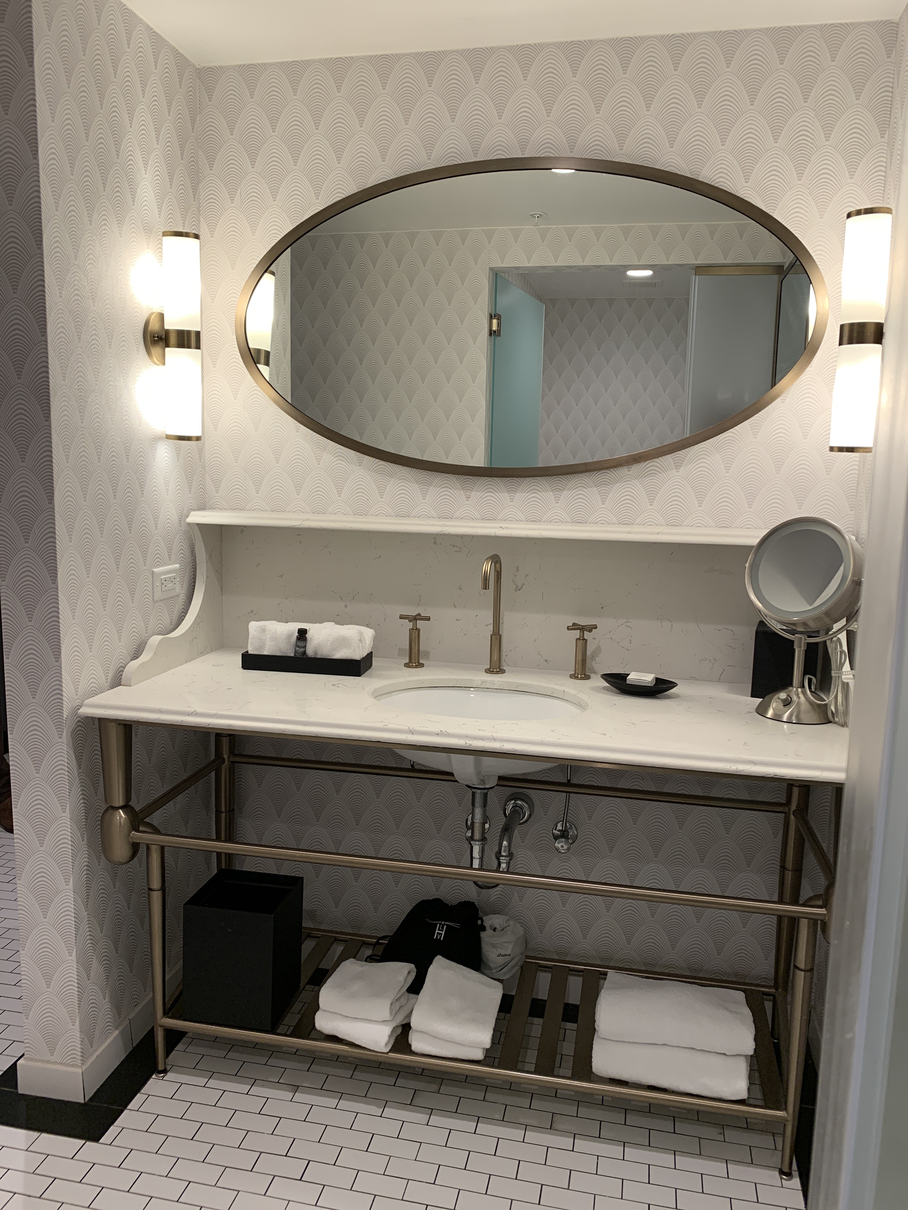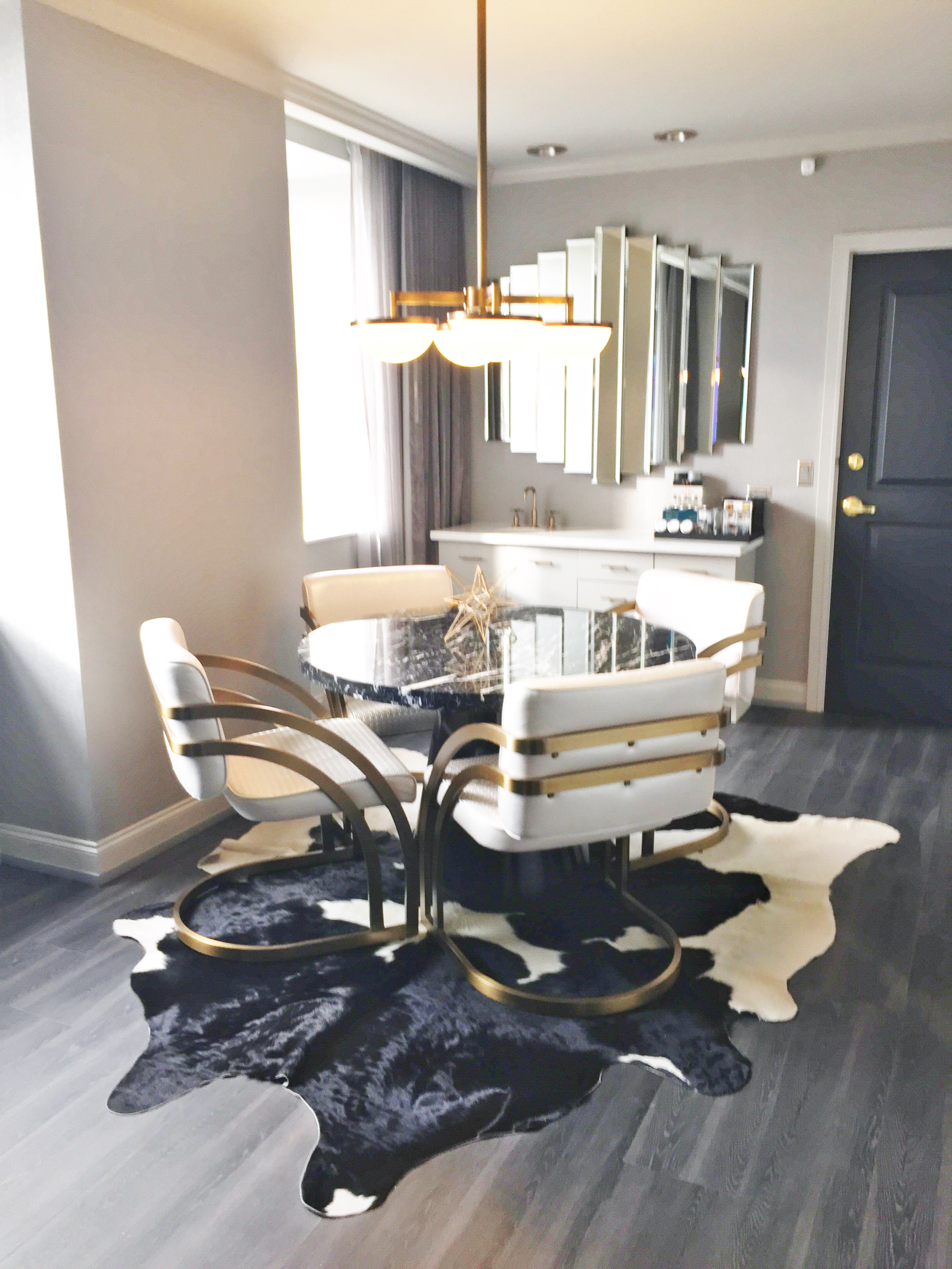 Keeping in line with the building’s Art Deco roots, the guest rooms hearken back to an era known for its’ glitz and glamor. Accents of gold, bold geometric shapes, opulent marbles, intricate metal work, and touches of animal prints evokes the sumptuousness of the Roaring 20’s and 30’s. The standard bedrooms are quite spacious, while the suites are nearly 800 square feet with attached living and dining room, along with an efficiency style kitchenette. We had a tenth floor king, but no matter which room you choose, there is plenty of space to spread out. The bathrooms, however, are the piéce de resistance of each space. Ours had a huge walk-in shower with both a handheld wand and rain shower head. The toilet was in an entirely separate water closet, while the suite bathrooms had a large soaking tub-shower combination.