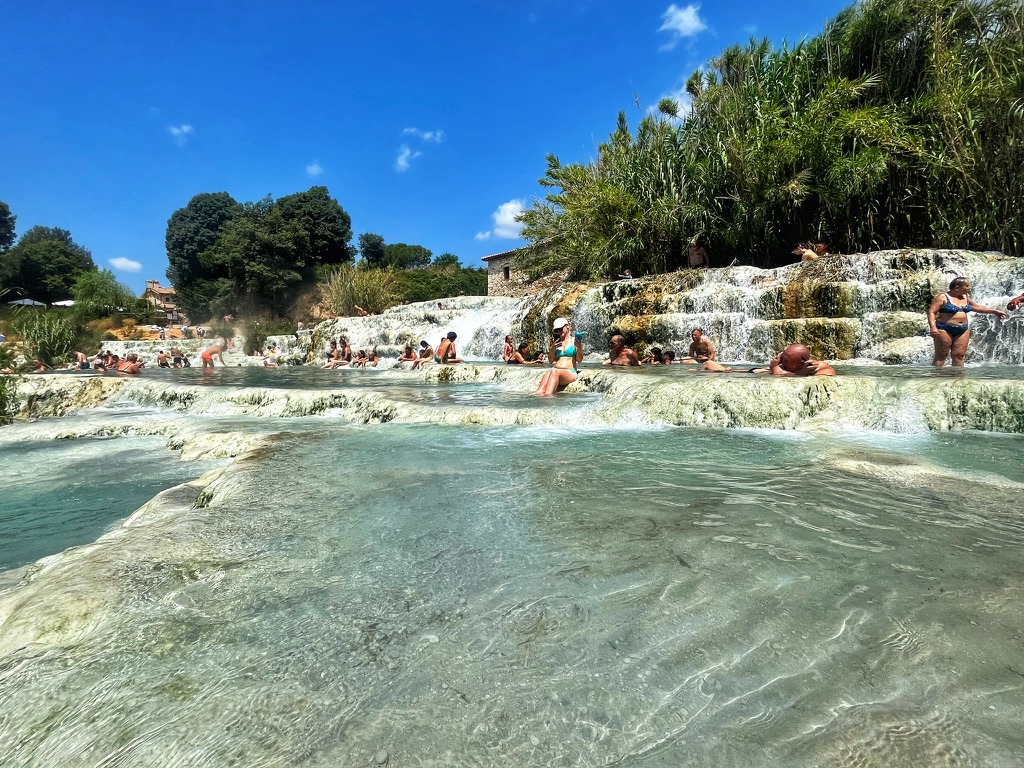 About two hours north of Rome, in the rolling countryside of southern Tuscany, the enchanting hot springs of Saturnia offer one of Italy’s most memorable natural experiences. Known for their cascading, mineral-rich waters, these thermal pools have been prized since ancient times for their restorative properties. The most iconic section, a series of tiered limestone basins formed by centuries of flowing water, creates a striking, almost otherworldly landscape.