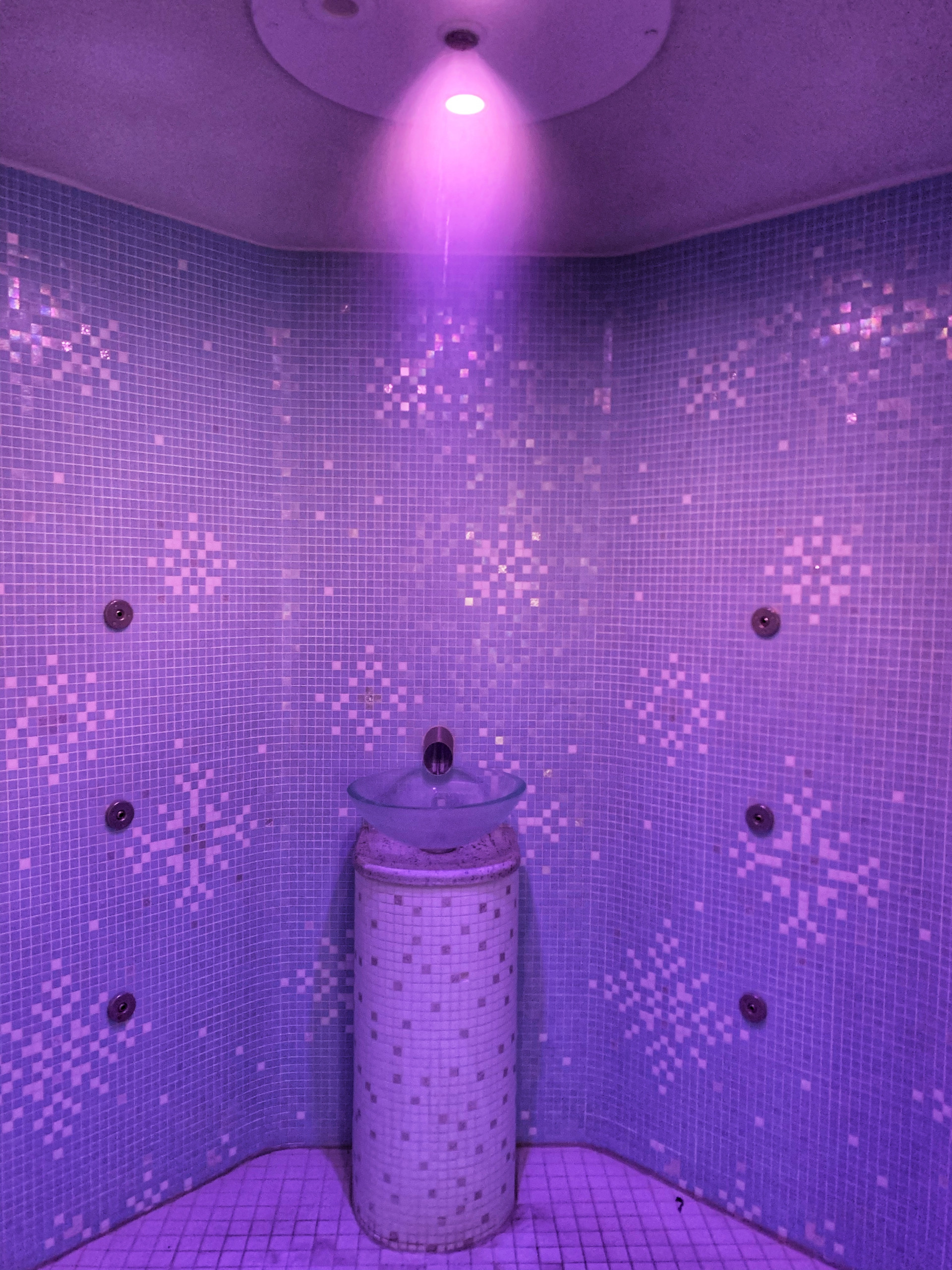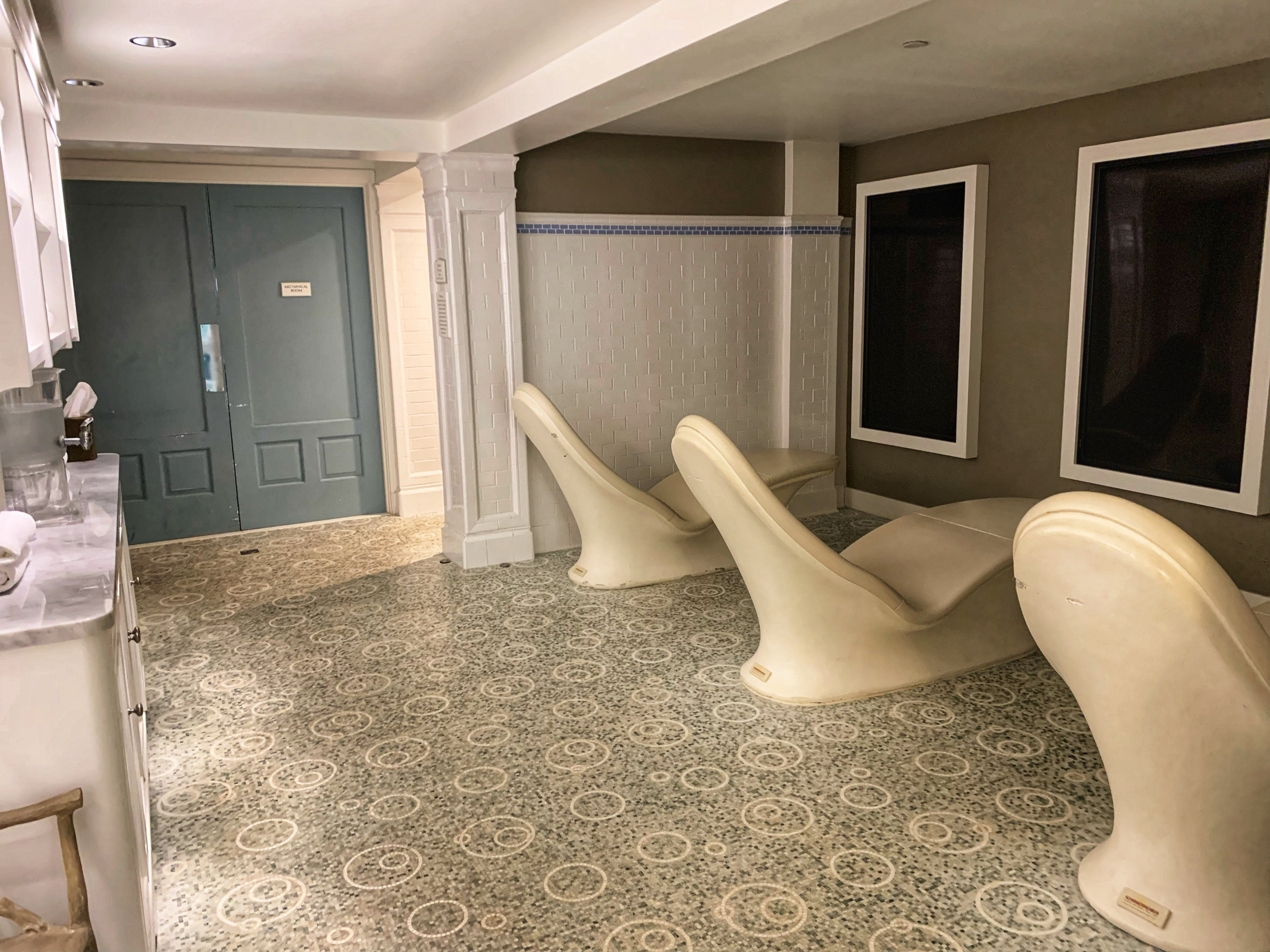 When the skies opened up, we took refuge inside the spa and retreated to our respective his-and-hers locker rooms. The Aqua Thermal Suite is an interesting take on European-style shower environments using hot and cold temperatures (think hot sauna then plunge pool). One of the experiential showers simulated various storm effects, so you can choose from a menu of Arctic, Caribbean, or Atlantic intensities and temperatures. The fun parts of the experience are the different lightning, sound effects, and shower strengths that definitely let your skin know it’s working. Then, just sweat it out in the Finnish sauna, allowing your body rids itself of toxins.