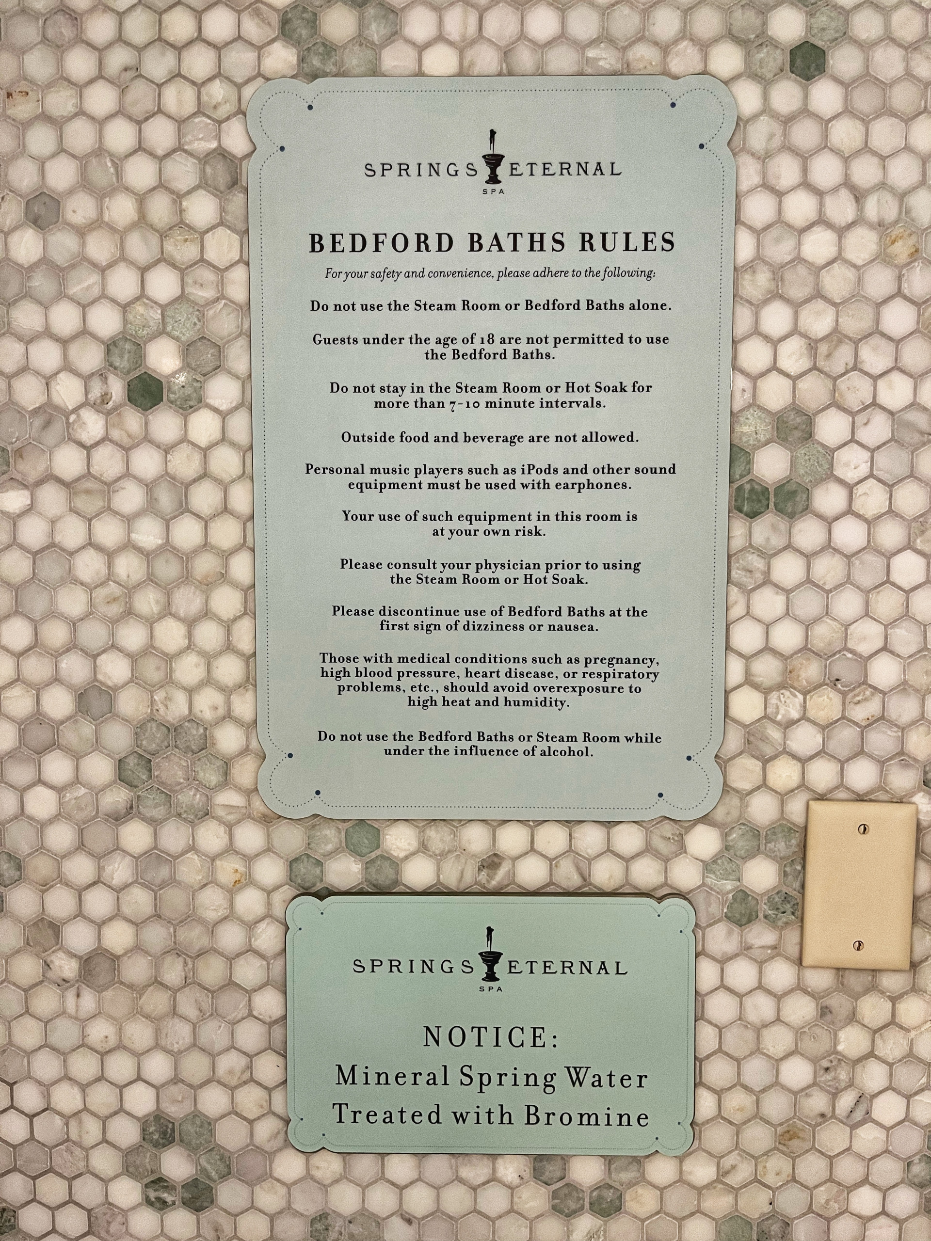Dan enjoys the same in the men’s locker room and we end up convening in the co-ed lounge for fruit, granola and tea- and nappy lounging. This is one of my favorite spa lounges because, not only can we share time together after doing the bath ritual in our respective his-n-her locker rooms, but the floor to ceiling windows offer ample sunshine and beautiful views of the mountains. The robes and loungers are plush. It’s one of my favorite spaces to recover from a deep tissue massage. There is an outdoor patio, but we have only been here in cooler months when it is not open, but it looks like it could be a little oasis in warmer climes. Our massages have been memorable and relaxing. The service top-notch. When registered for a spa treatment, use the wet areas are included through the day. We sometimes leave for lunch and come back for a repeat bath ritual. It’s a beautiful experience. Pamper yourself. Your worth it!