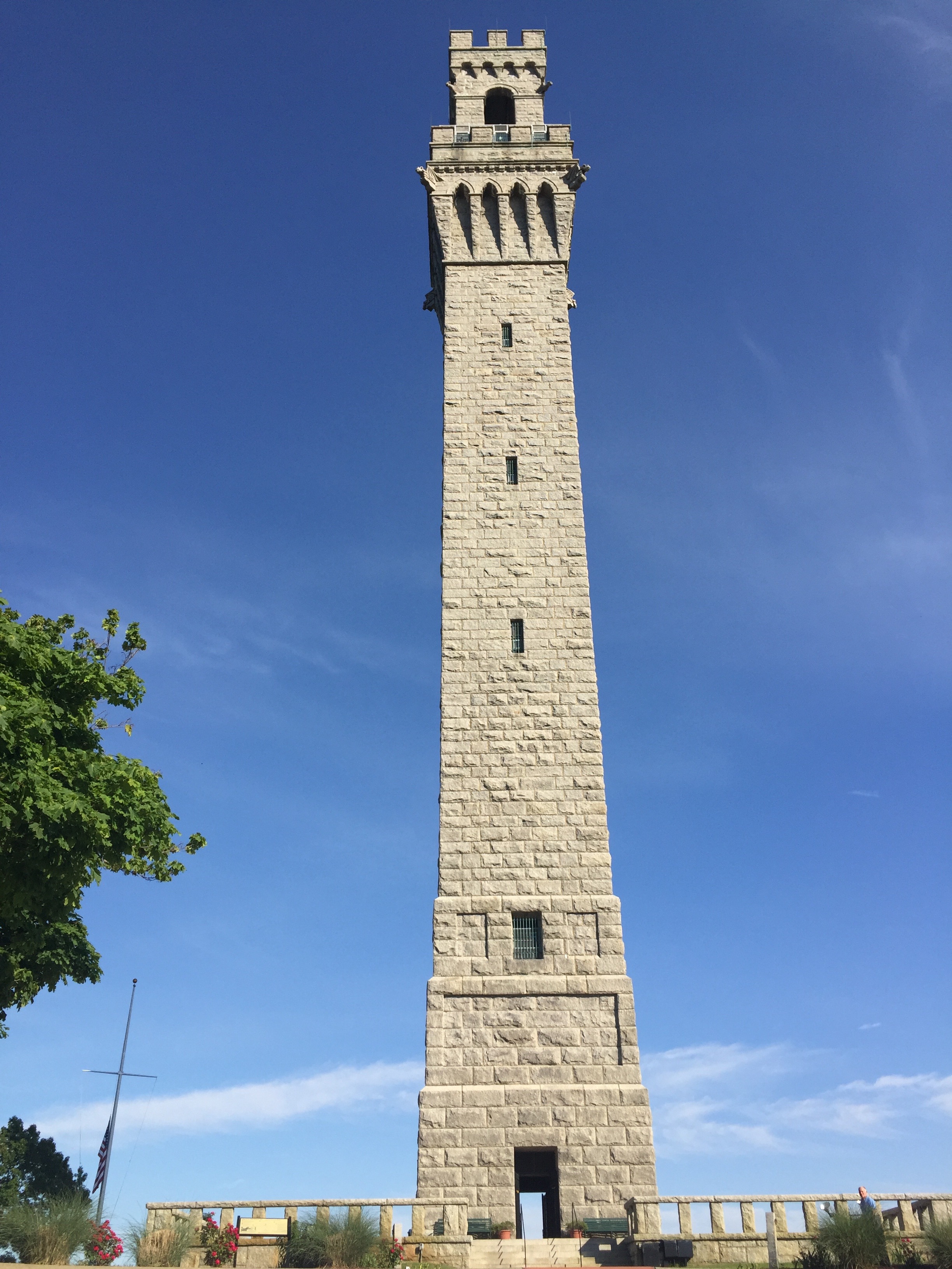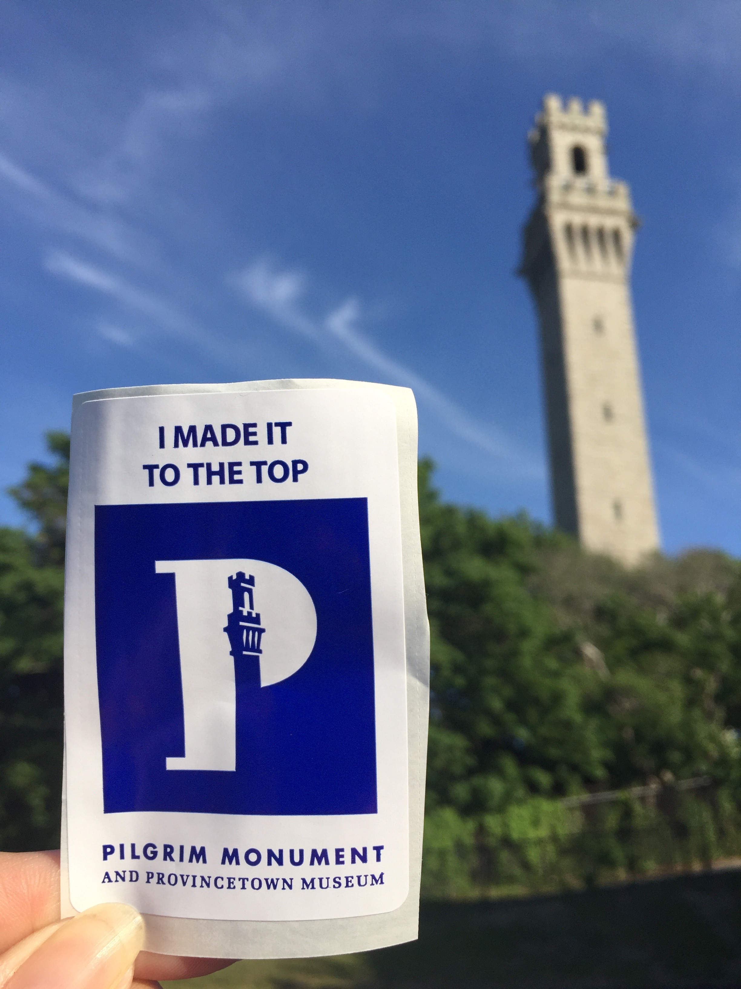 Work off lunch, by climbing through history to the top of the 252-foot Pilgrim Monument (c.1910), the country’s tallest granite structure. The Italian-inspired tower commemorates the pilgrims’ first landing in Provincetown before sailing on to Plymouth. The view is worth the effort! We chanted “derrière extraordinaire” as we spiraled up the 116 steps and 60 ramps (probably 500 steps total) to magnificent vistas over the town and bay. The Chamber of Commerce weather allowed us to see out over the Province Land Dunes with view of the lakes and glimpses of the ocean. It was hard to tear ourselves away from the bird’s eye view, but going down the steps was much easier!